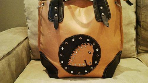 Stunning Ladies Caramel/Black PU Leather Handbag or Shoulder Bag With Beautiful Detail & Design, the front has diamante horse design, great space for just about anything and everything, BEAUTIFUL PIECE...