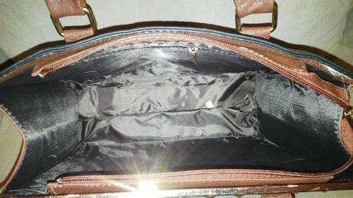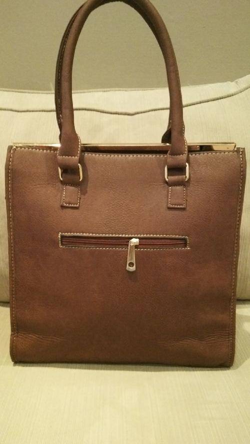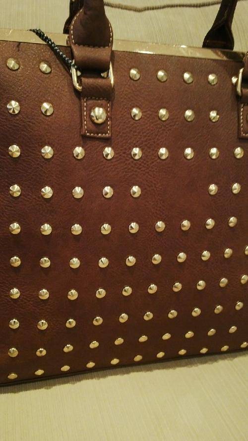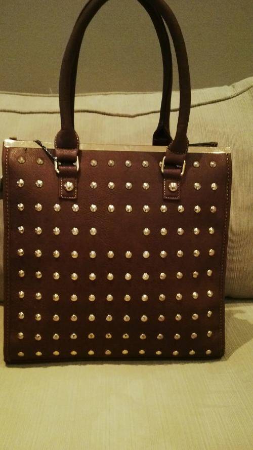 Stunning Ladies TAN PU Leather Handbag With Beautiful Detail & Design, the front has gold like studs embedded into the bag and a gold trim on the top, great space for just about anything and everything, BEAUTIFUL PIECE...