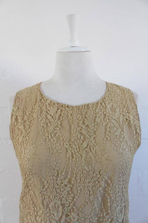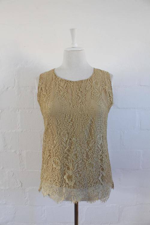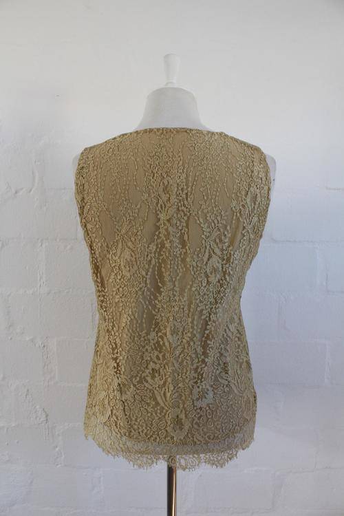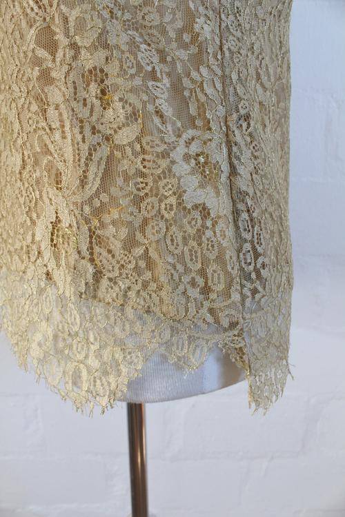 Authentic vintage lace overlay silk top. Overall good condition, with a piece of lace torn out from bottom hem on one side. On one small section of the top the gold wrapping of the thread is missing, revealing the yellow plain thread underneath (barely noticeable - see last photo). Size 10/ 34.