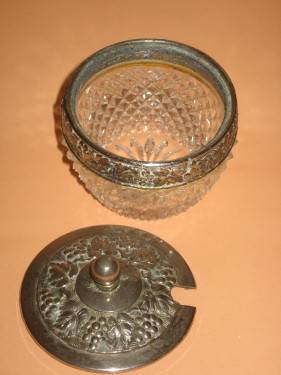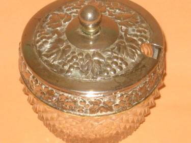 An Old Hobnail Glass Mustard Pot with Silver Plated Top. About 6cm in diameter and 4cm in height.