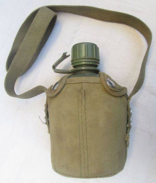 1 liter water bottle with olive green canvas carrier and sling. Selling as found. Very good condition. Tracked postage is R75.00.
