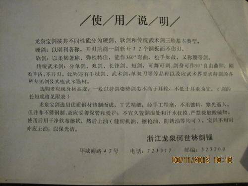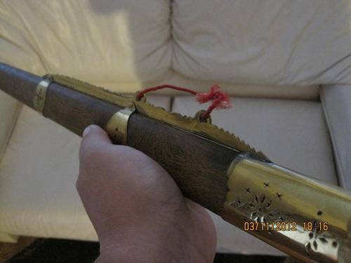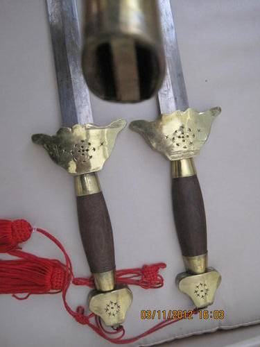 I do not know much about the sword, on the box it comes in, it does show that it was brought into South Africa from China in 1995. I have been told that it is a Wushu Kung-Fu sword but I cannot say this for sure. I have also been told that although perhaps used as an ornamental piece, this is a real sword and quite expensive. Please view all the pics and decide for your self. At first glance, it looks like a single sword, but when you take it out of the wooden pouch thing, one notices that it is actually two swords. There is some engraving on the swords, one looks like a dragon with stars and the other has maybe some sort of bird with stars ans chinese writing. Payment can be done end November.
