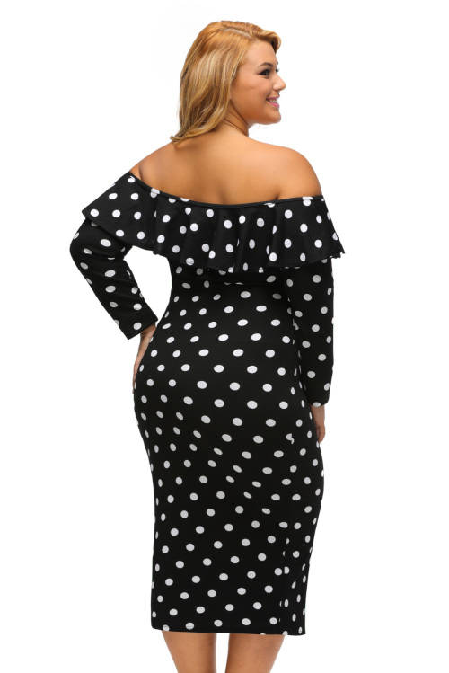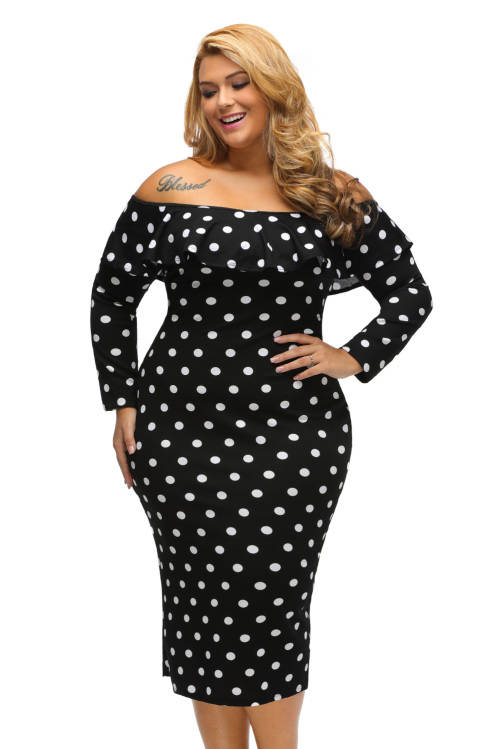 Gorgeous and noble off the shoulder dress in classic polka dots. With soft stretch-crepe, it’s sure to contour your body, just feel flirty with its revealing off-shoulder ruffled neckline. Long sleeves, side zipper, curve-hugging fit and stretchy.