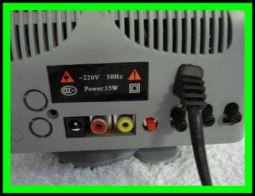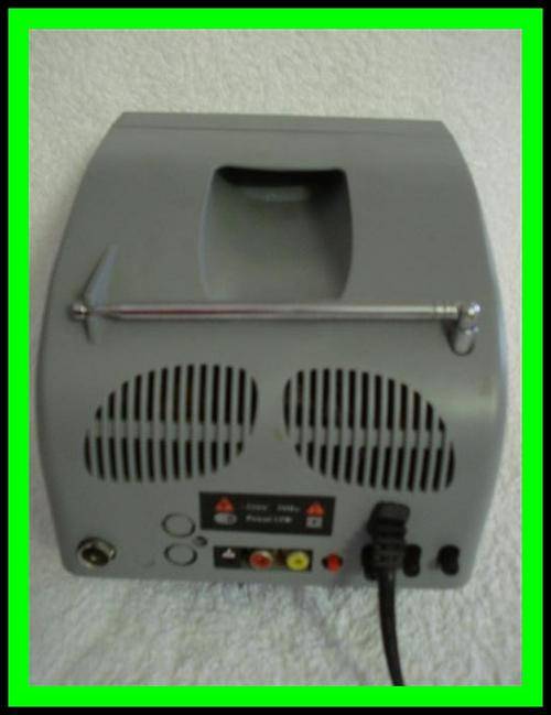 Size is aprox. 13 cm Diagonally!! It has AV input and can even work on Batteries. Has AM/FM Function aswell.