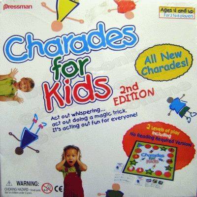Charades for Kids: Featuring 450 charades, the charades are simple and fun. Players may be acting out "Feeding a Baby" or simply "Smiling." If you get another player to guess the charade correctly, you both move ahead on the gameboard and special "All Play" squares get everyone in the action. Charades for Kids also features picture cards to that children who aren't old enough to read can get in on the fun!