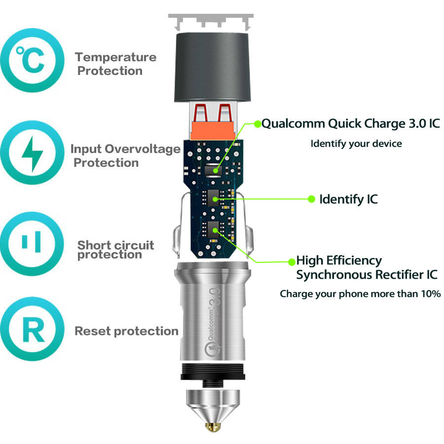 A Quick Charge 3.0 enabled device must be paired with a Quick Charge 3.0 certified adapter; Multiple built-in safeguards protect against over-current, overcharging and overheating for safe and fast charging.