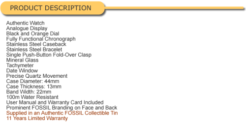**R1,595.00** FOSSIL AUTHENTIC BLACK AND ORANGE DIAL STAINLESS STEEL CHRONOGRAPH **BRAND NEW!!!**