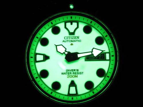 AUTOMATIC MOVEMENT, DAY-DATE CALENDAR, SOLID STAINLESS STEEL CASE, LUMIBRITE DIAL, SCREW-IN CROWN, CITIZEN DIVER'S BAND, SCUBA ABILITY, WR 200M, HARDLEX CRYSTAL, LUMIBRITE HANDS WITH BLACK DOT MARKERS, ROTATING BEZEL, CASE 41MM, THICKNESS 13MM, COMES IN A GENERIC BOX WITH MANUAL.