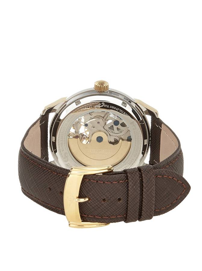 Stainless Steel Case on Brown Genuine Leather Padded Strap, Silver Tone Skeletonized Dial, Gold Tone Bezel, with Gold Tone Accents