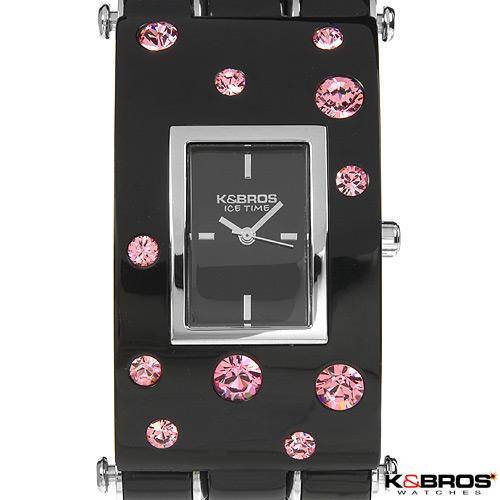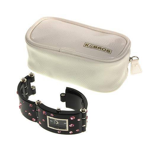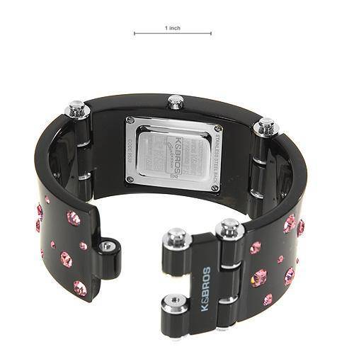 K and BROS quartz 34 mm 12 mmProduct Type Watch original brand name condition brand new functions date model 9530-2 movement Watch Bracelet: color black max length 7.75 inch Watch Case: total item lenght 67 mm width height material base metal color silver color black gemstone info: gemstone crystal shape round color pink Other Information: gender Ladies