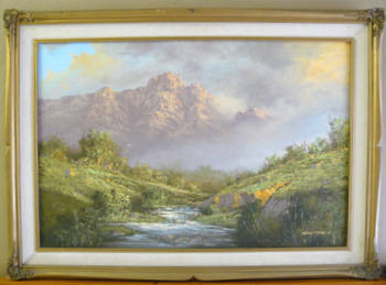 On offer this masterfully painted Oil on Canvas laid on Board by artist Eric Forlee who was born in China and then moved to Africa. Depicting this magical landscape, so realistic one can almost feel and touch it. The misty mountains with a river in foreground makes for a truly stunning and memorable work of art, certainly a great investment! His paintings are prized by animal lovers and art collectors as his work "captures the essence of Africa" and has a special three-dimensional quality that brings the subjects to life. Forlee was born in 1949 in China and at the age of 14 was listed as an enemy of the Chinese Communist Government, simply because his parents lived in South Africa. At age 19 he was imprisoned in a concentration camp, survived 5 years and eventually managed to escape, avoiding being killed while doing so. In a few years he managed to save enough money to join his parents in South Africa. He immediately started painting the African landscapes and in particular concentrated on African Wildlife and he has never departed from the subject. The intensity and quality of his art has earned him the status of Master International Artist.