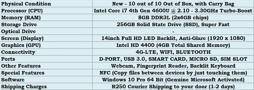 **R27,000** New. HP Elitebook Folio 1040 4th Gen i7, 256GB SSD, 8GB, 4G-LTE, NFC, Full HD, Win 10