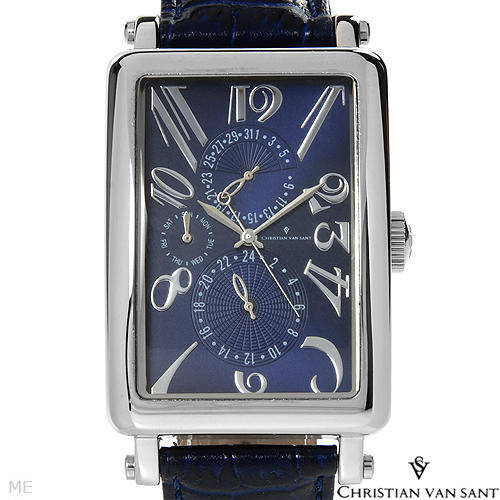 item Watch original brand name Christian Van Sant condition brand new functions day date model 3ag121203 movement quartz Watch Bracelet: material leather color blue max length 8.5 inch min length 7.0 inch Watch Case: height 11 mm total item length 54 mm material stainless steel color silver width 32 mm water resistant 50m other info: gender gentlemens