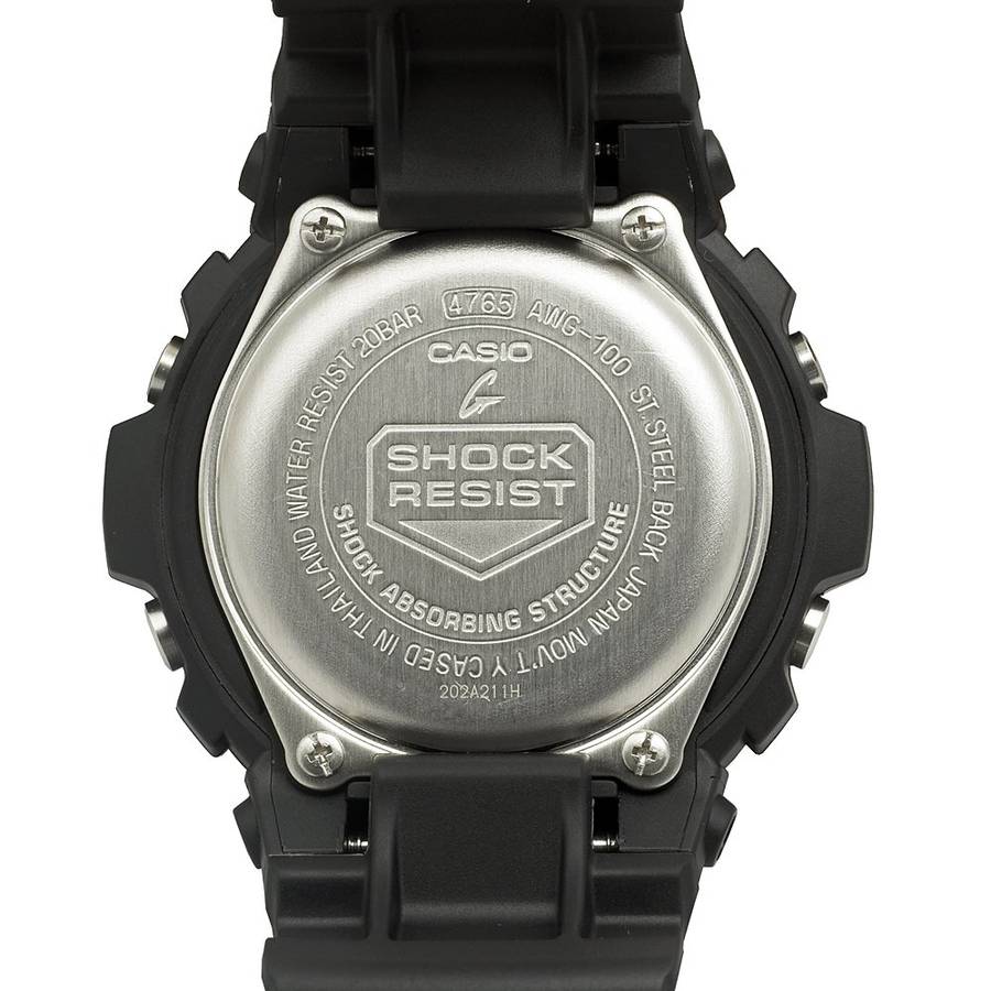Brand Name: Casio Model number: AWG100-1A Part Number: AWG100-1A Model Year: 2011 Item Shape: round Dial window material type: Mineral Display Type: analog Clasp: Buckle Case material: stainless-steel Case diameter: 46.00 Case Thickness: 15.00 Band material: Resin Band length: mens Band width: 25 millimeters Band Color: black Dial color: black Bezel material: Resin Bezel Function: stationary Calendar: day-date-and-month Special Features: alarm-feature, shock-resistant, water-resistant item-weight: 4.80 Ounces Movement: Quartz Water resistant depth: 660 Feet