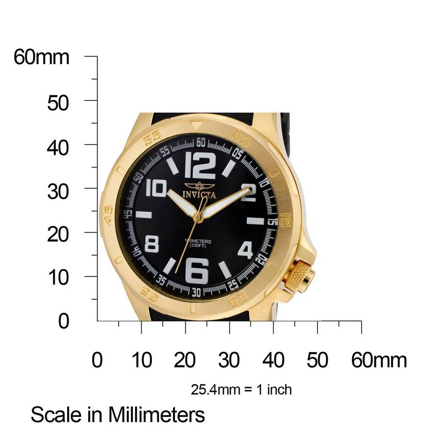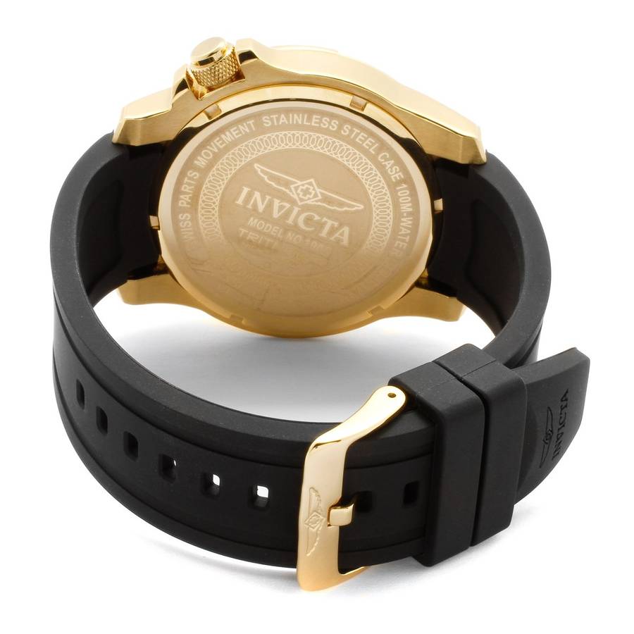 Brand Name: Invicta Model number: 1905 Part Number: 1905 Item Shape: round Dial window material type: flame-fusion Display Type: analog Clasp: Buckle Case material: stainless-steel Case diameter: 48 millimeters Case Thickness: 13 millimeters Band material: Polyurethane Band length: mens-standard Band width: 24 millimeters Band Color: black Dial color: black Bezel material: Stainless Steel Bezel Function: unidirectional Movement: swiss-quartz Water resistant depth: 100 Meters