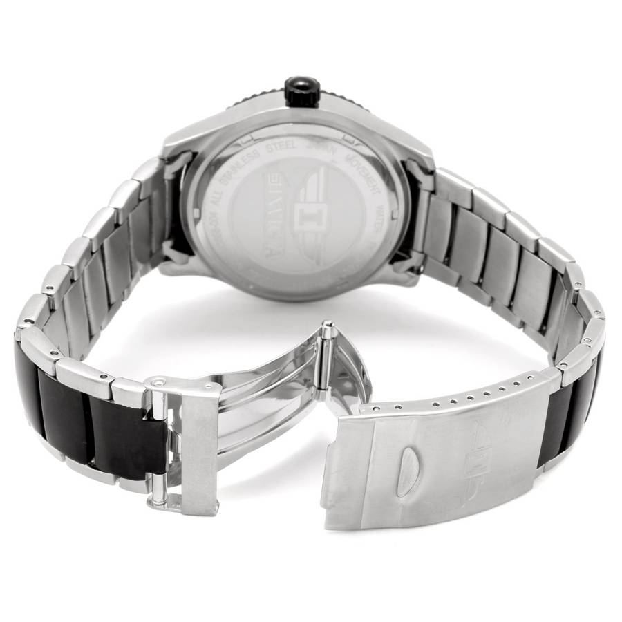 Brand Name: Invicta Model number: 43658-004 Part Number: 43658-004 Item Shape: round Dial window material type: Mineral Display Type: analog Clasp: fold-over-clasp-with-double-push-button-safety Case material: stainless-steel Case diameter: 45 millimeters Case Thickness: 13 millimeters Band material: stainless-steel Band length: mens-standard Band width: 24 millimeters Band Color: black Dial color: black Bezel material: stainless-steel Bezel Function: unidirectional Calendar: day-and-date Special Features: water-resistant Movement: japanese-quartz Water resistant depth: 165 Feet