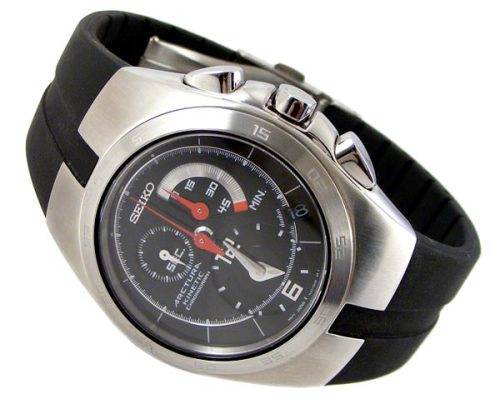 Multi layered black dial with red and polished steel hands and indicators.