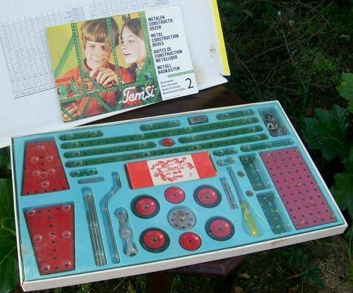 Temsi (an acronym for Technical Electric Metal Toy Industry) was basically a metric version of Meccano. The Temsi company was founded in 1946 by a local stamp manufacturer, Jan Blom, in the Dutch city of Hengelo. Blom apparently copied the Meccano system and then began producing his own sets, marketing them under the Temsi name. [He was able to do this, it seems, because of insufficient patent protection on the Meccano system at the time]. By the 1950s, Temsi had become a major name in the construction toy market in Europe, due in part to the scarcity of Meccano sets in European toy stores in the years immediately following WWII. However, a combination of rising manufacturing costs and declining interest in traditional construction toys in the 1980s forced the company to declare bankruptcy.