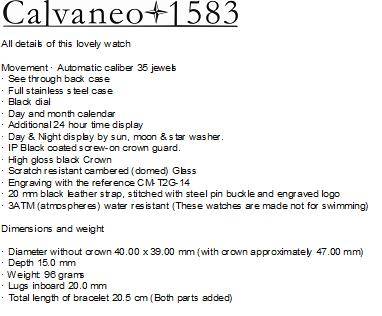 Watches from Calvaneo 1583 are Quartz chronograph or Automatic watches using Swiss or Japanese movements (ISA, Ronda, ETA, Miyota).