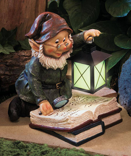 EACH SHIPPED SEPARATELY - NO COMBINED SHIPPING.  This storybook gnome creates an endearing scene wherever you place him, lighting up his page with a glow-in-the-dark lantern held in one hand, and he has a magnifying glass in the other. Dressed in a green coat and red hat with reading glasses perched on his nose, he is seated in front of a pile of books with the top one open. Cold cast ceramic. Measures approx. 8-1/2" x 8" x 6-5/8"; metal lamp is approx. 4" x 2-3/4" sq. OVERSIZE SHIPPING (see below).