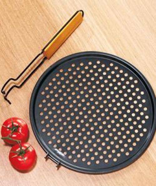 EACH SHIPPED SEPARATELY - NO COMBINED SHIPPING with other auctions. This Pizza Grill Pan gives your pie a smoky taste that's hard to resist! Cook your pizza in the great outdoors with this specially designed steel pan. The holes on the bottom give the crust a crispy texture just like your favorite pizzeria. The nonstick surface lets the pizza slide right out for easy serving. The handle is foldable for easy storage, and it is removable so you can use the pan in a conventional oven. Hand wash; oven safe to 500°F. Pan is 13" dia.; the handle is 12-1/2" long. OVERSIZE SHIPPING (see below).
