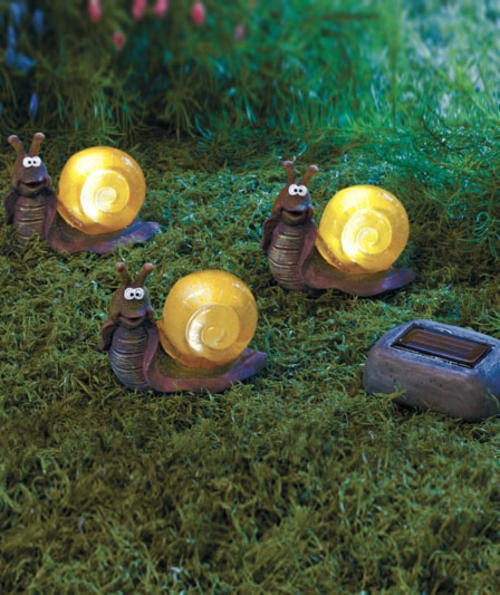 EACH Set of 3 SHIPPED SEPARATELY - NO COMBINED SHIPPING with other auctions. The set includes 3 snails and a solar panel that looks like a rock (3-1/2" x 3" x 1-1/4"). The solar panel, on a separate piece so you can put it in the sun and the lightened snails in the shade, absorbs the sun's energy during the day to light up the animals at night. The lights constantly change from bright to dim. There's a 15" lead from the solar panel to the first animal and 16" between each animal. Includes an on/off button on the bottom of the rock. Each measures 4" x 3-1/4" x 2-1/2". Made of cold cast ceramic. OVERSIZE SHIPPING (see below).