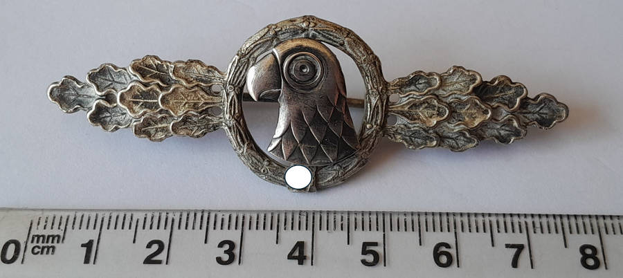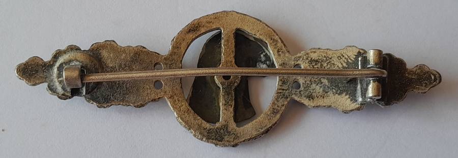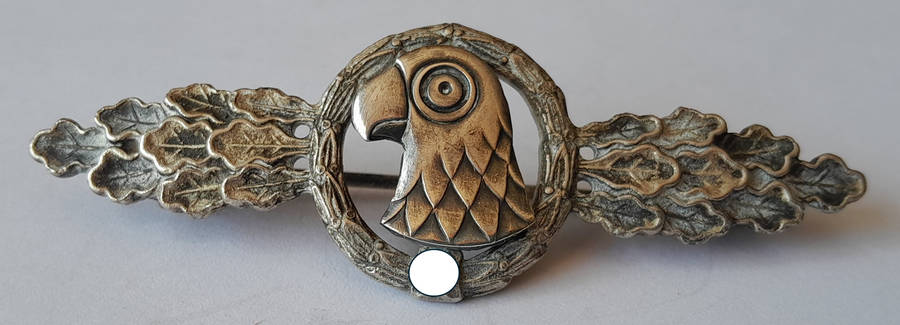Rare WW2 German Luftwaffe Frontflugsspange Aufklärer (Front flight clasp reconnaissance aircraft) squadron clasp badge in silver grade (for 60 flights). The Frontflugspange was established on January 30, 1941 by the commander-in-chief of the Luftwaffe, Hermann Göring. Note : The clasp is not the typical barrel clasp so could be a later replacement. There is no maker's mark that I can see. The sw****ka at the base of the badge has been censored as per Bob Shop policy.