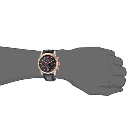 Grey textured dial with grey border, rose gold tone, red and white hands and rose gold tone and white hour markers and Arabic numerals; sapphitek crystal; rose gold tone ion-plated stainless steel case; black leather strap