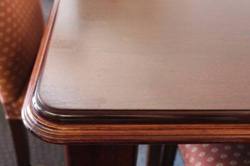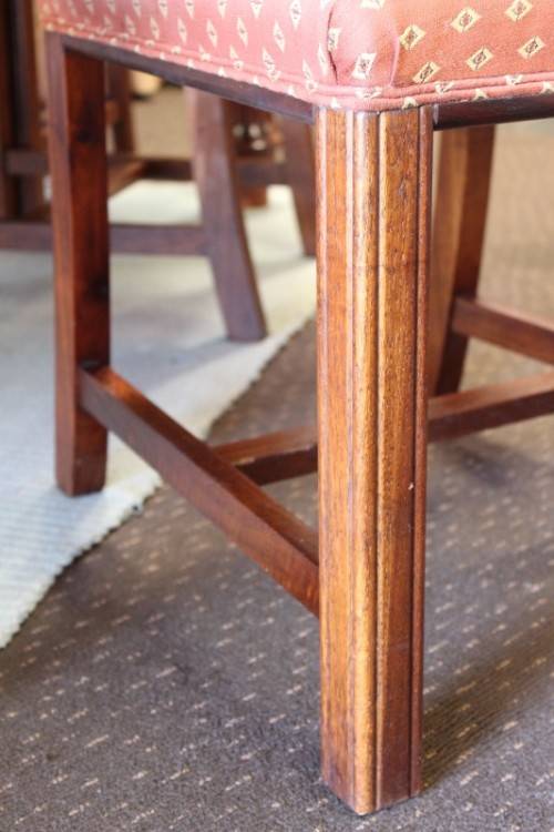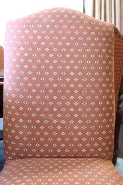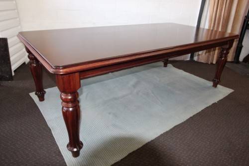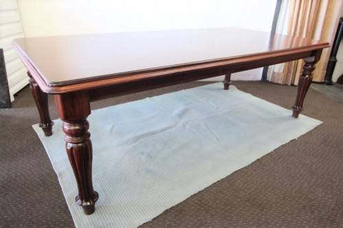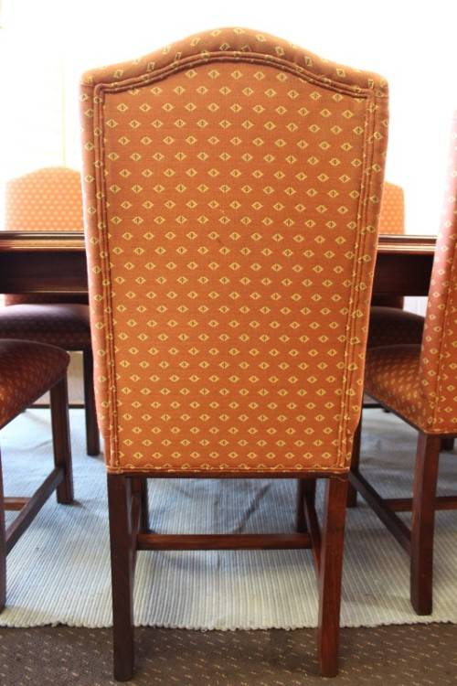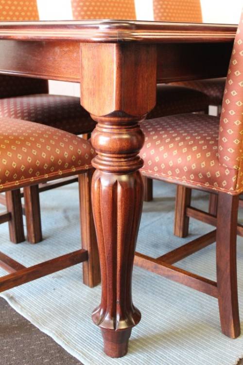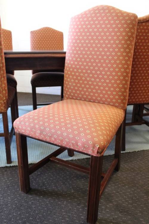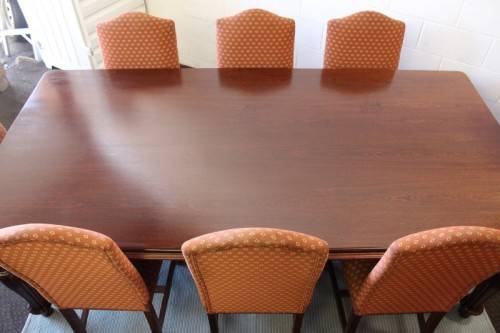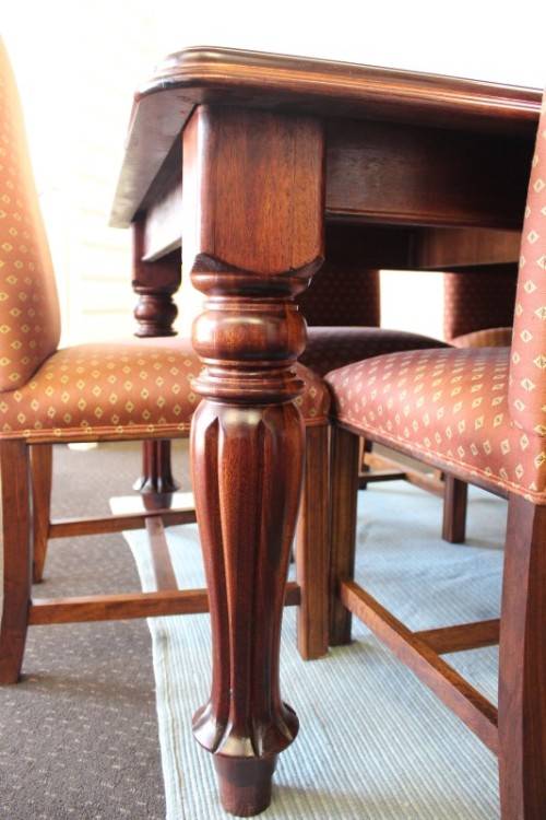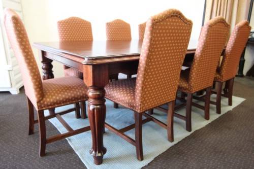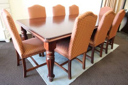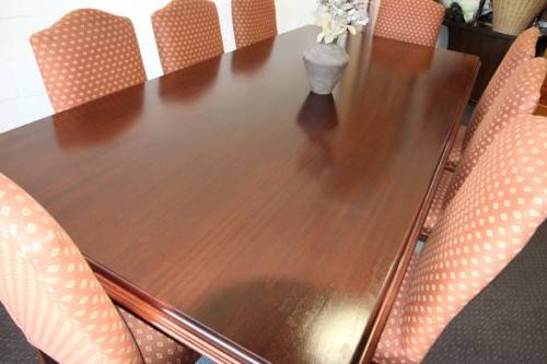 This superb mahogany eight-seater dining room suite with a large 240cm long x 120cm wide x 79cm high table and eight stunning upholstered high-back dining chairs is in amazing condition and is a high-end dining room suite. The table is large enough to accommodate 10 dining chairs (use the eight existing chairs and get two stylish carver chairs). The incredible stylish table legs make it a particularly beautiful table that would look amazing along side a buffet server etc. The chairs each measure 53cm long x 49cm wide x 106cm high. The upholstery is still in good condition (normal usage related wear and tear) and the chairs can be re-upholstered to suite your decor or colour scheme. The chairs sit firmly on the ground and are comfortable quality chairs. This dining suite is a very attractive suite and the quality is very evident in just handling the furniture. Please view the pics carefully to fully appreciate this stunning large family size dining suite and to confirm the condition.