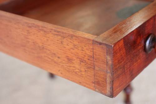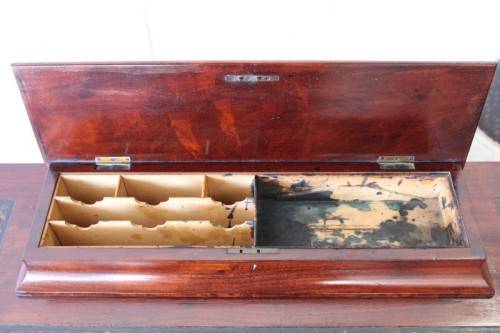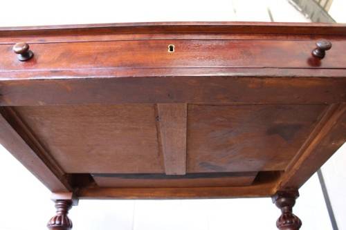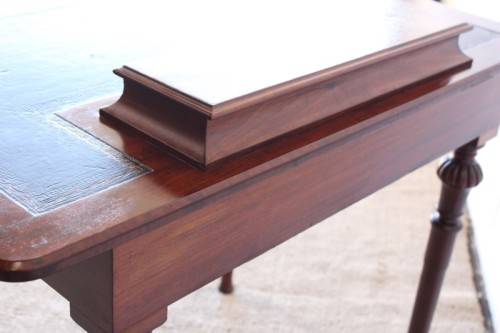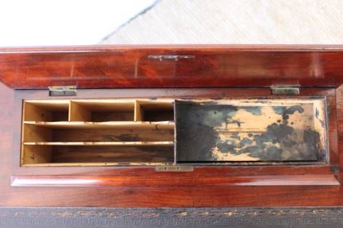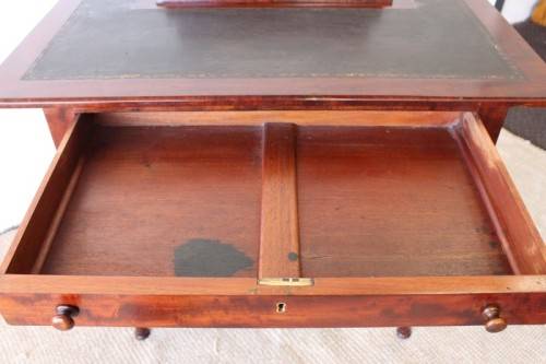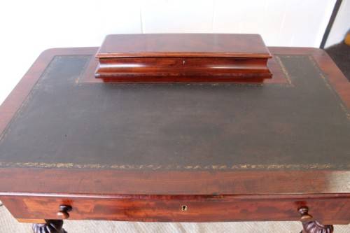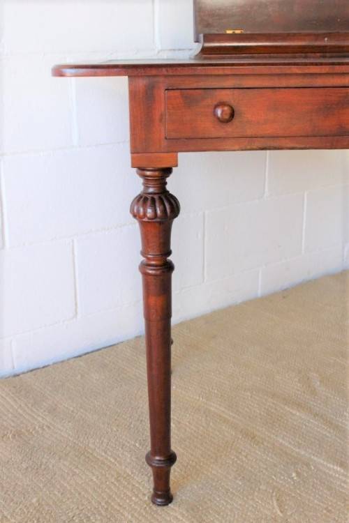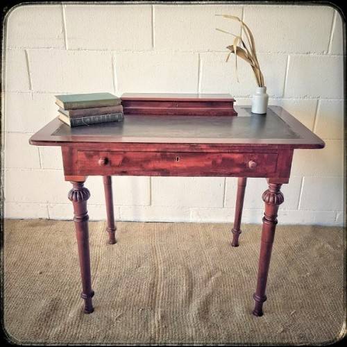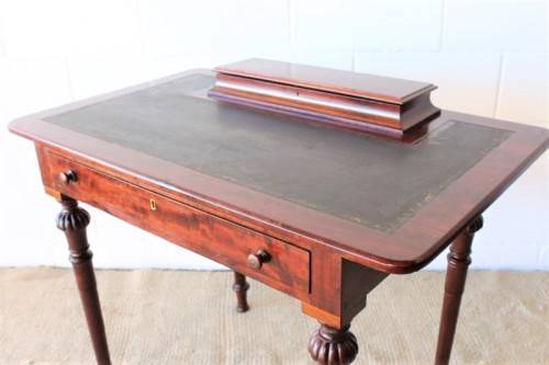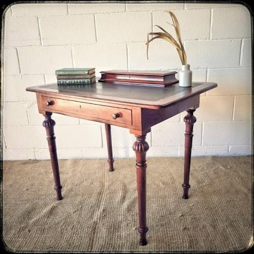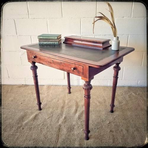 This beautiful antique Victorian single drawer, tooled brown leather-top with gold gilt rosewood library writing desk with a fitted stationary compartment is in amazing condition and looks to date to around 1875. The desk rests on four stylish turned fluted legs and has a single full length drawer below the writing top. The stationary compartment has a hinged lid and has a collection of slots for writing paper, envelopes and quills etc. The desk measures 92cm long x 56cm wide x 75cm high. The is minimal/ normal age related wear and tear associated with an antique piece, but the desk is still very beautiful and has been well looked after. This would make the perfect desk in a small conservatory or in a bedroom or living room etc. Please view the pics carefully to fully appreciate this antique Victorian Rosewood writing table and to confirm the condition.