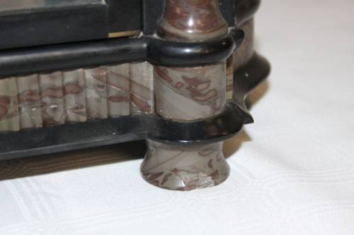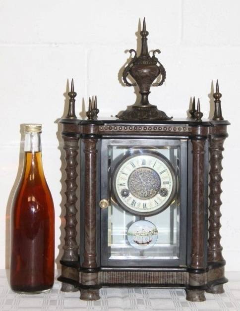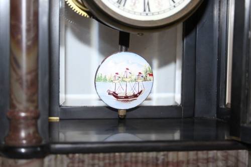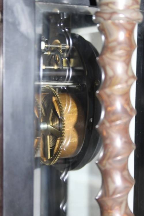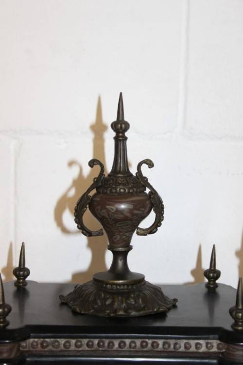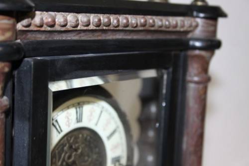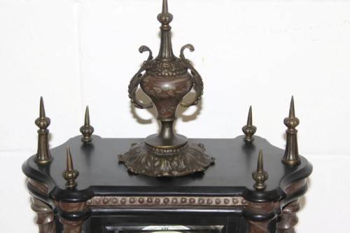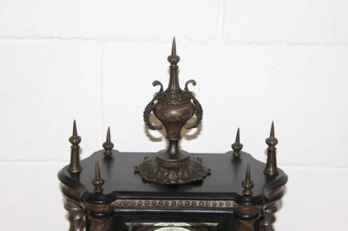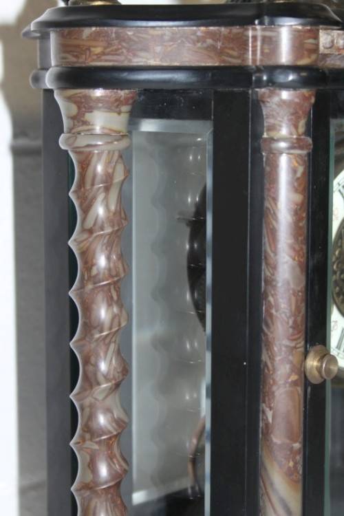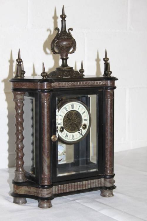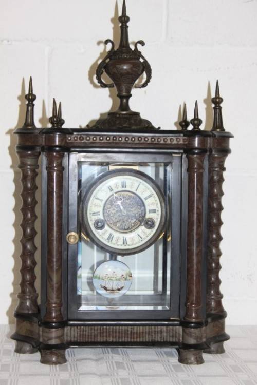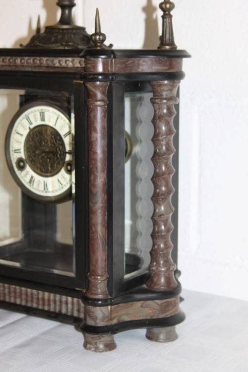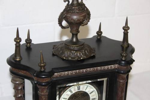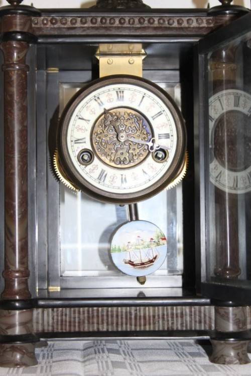 This spectacular large red marble/ granite?, bronze and bevelled glass panelled double-door pendulum mantle clock with a porcelain dial is a truly superb example of 17th century French mantle clocks. The exquisitely detailed bronze embellished mantle clock has a door on the front and on the rear of the clock and has an eight day mechanical mechanism which chimes on the half and hourly intervals. This incredible mantle clock measures a very decent 31cm long x 17cm wide x 49cm high. There is a small chip on the foot of the mantle clock, but it in no way detract from the appeal of this wonderful mantle clock. The pendulum has a hand painted sailing ship on it. Please view the pics carefully to fully appreciate this stunning antique replica French mantle clock and to confirm the condition, it's brand new.Please view the shipping options or request courier costs prior to purchasing any of our products.