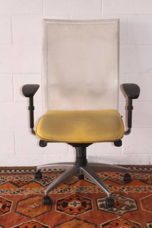 This modern styled yellow and white office chair with tilt, height and tension adjusters also has height adjustable armrests. The chair is in good condition, however, it would need a good clean. The chair base is brushed aluminium. The chair is made by Dauphin who specialise in office and industrial chairs. The office chair measure 71cm long x 53cm wide x 108cm high. Please view the pictures carefully to fully appreciate this stylish office chair and to confirm the condition. Please view the shipping options or request courier costs prior to purchasing any of our products.