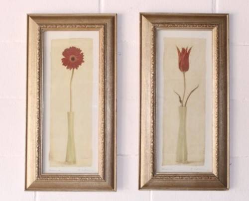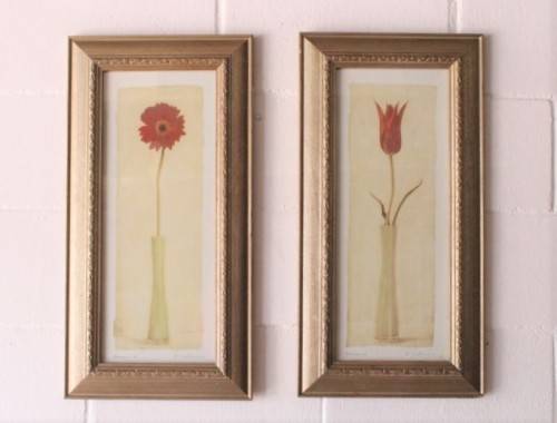 This beautiful pair of framed single stem flowers in vases include a red tulip and a red daisy. The prints have been framed behind glass and are in good condition. There are minimal scuffs and scrapes on the antique gold frames and the framed prints each measure 32cm wide x 62cm high. The one frame (see pic) has a "dent" in the bottom right hand corner. These lovely prints are titled "Blossom I" and "Blossom II" respectively. Please view the pics carefully to fully appreciate these two wonderful framed behind glass floral prints and to confirm the condition.