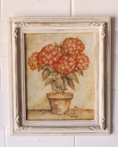 This exquisite pair of whitewashed framed botanical prints including a bowl of red tulips and a potted red & white hydrangea. The frames are beautifully carved and it adds to the charm of these two lovely prints. The prints have been framed behind glass and are in good condition. There are minimal scuffs and scrapes on the frames. The framed prints each measure 56.5cm wide x 66cm high. Please view the pics carefully to fully appreciate these two wonderful framed behind glass floral prints and to confirm the condition.