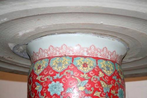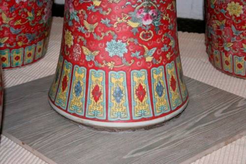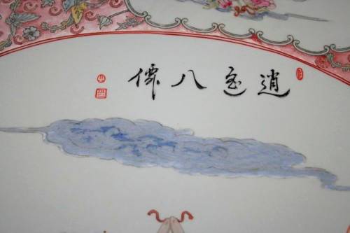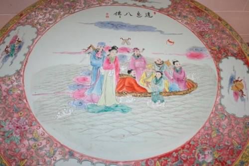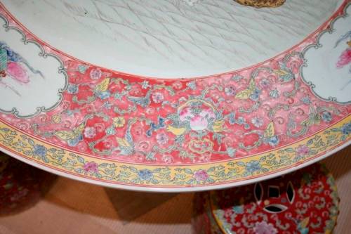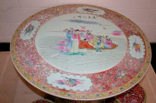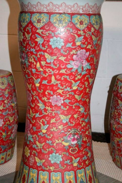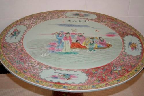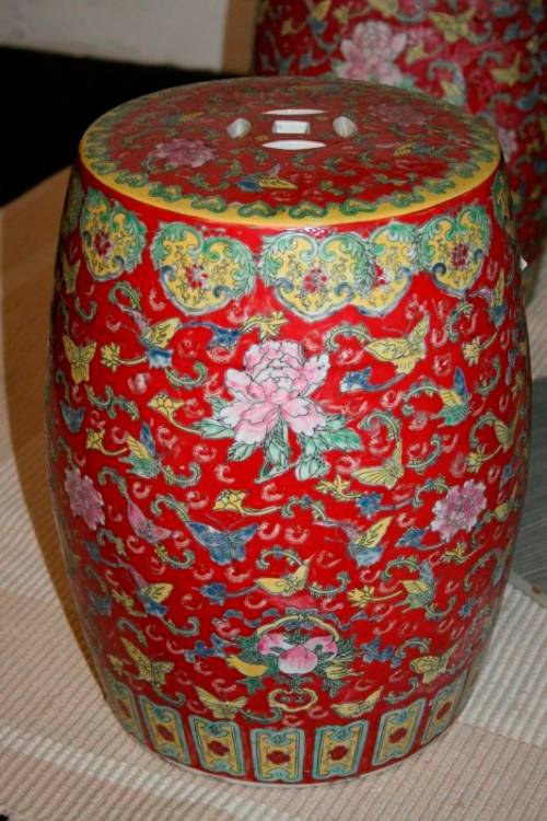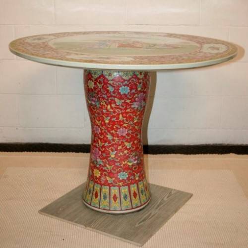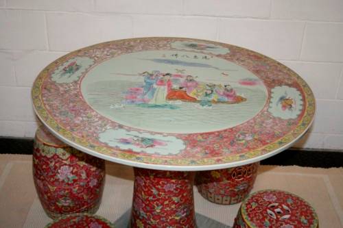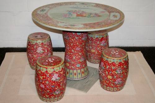 This stunning hand painted and glazed Chinese porcelain (ceramic clay) garden table and four stools is a wonderful find and a very beautiful set. The set is hand painted and then glazed and baked in the traditional Chinese style keeping the colours rich and vibrant. According to the internet, the artists signature is on the table top. (see pic) The table measures a decent 91cm across and is 71.5cm high and each of the four stools are 38cm high x 28cm wide. This is a wonderful set and has awesome weight to it. The table has been mounted on a tile to keep it sturdy, and could also be concreted in. Two of the stools have cracks in them that have been repaired. Please view the pics carefully to fully appreciate this incredible hand painted Chinese porcelain garden set and to confirm the condition.