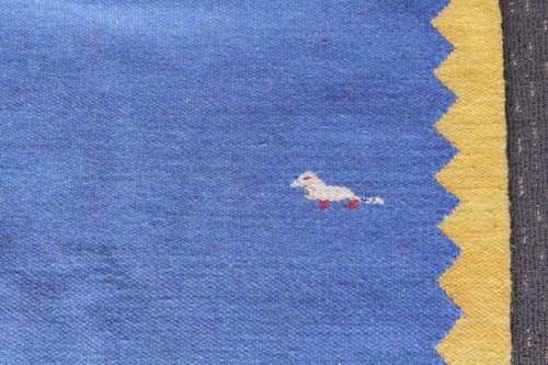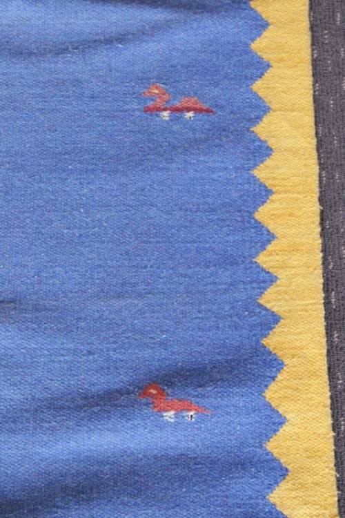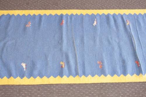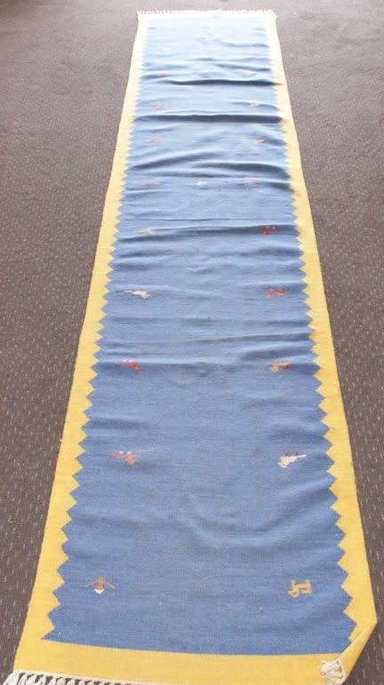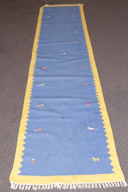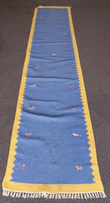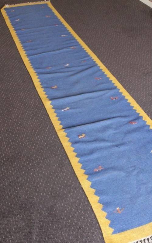 This superb very long original Iranian blue and yellow "Qashqai Gabbeh" pure wool runner carpet measures a very decent 367cm long x 75cm wide. A Gabbeh is a hand-woven pile rug of coarse quality characterised by an abstract design that relies upon open fields of colour and a playfulness with geometry. This type of rug is popular among the populations of the Zagros Mountains of Iran, including Kurdish, Luri and Qashqai people. The gabbeh is usually crafted by women. Gabbeh patterns are of a very basic kind with only a limited number of decorative, mostly rectangular objects resembling mainly animals. In gabbeh usually bright colours, such as yellow and red, are used. Although large fields of solid colour are used in gabbeh designs, the colour is variegated (the colour varies throughout the rug, with the appearance of differently coloured zones). Gabbehs are made of natural, hand spun wool yarn and all the colours are created with natural plant dye. There is minor age and usage related wear and tear. Please view the pics carefully to fully appreciate this stunning Iranian Gabbeh carpet and to confirm the condition.