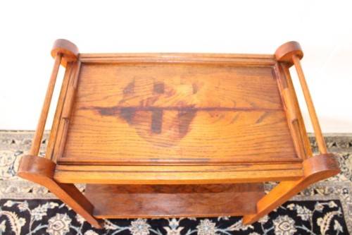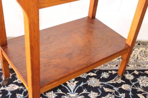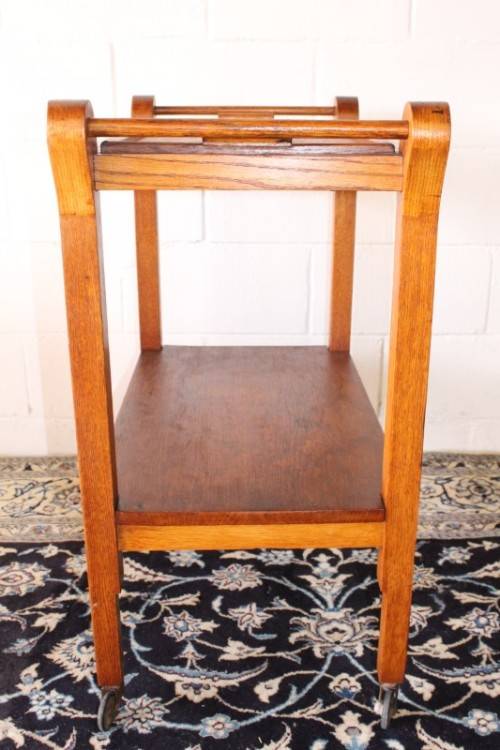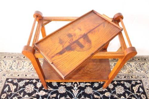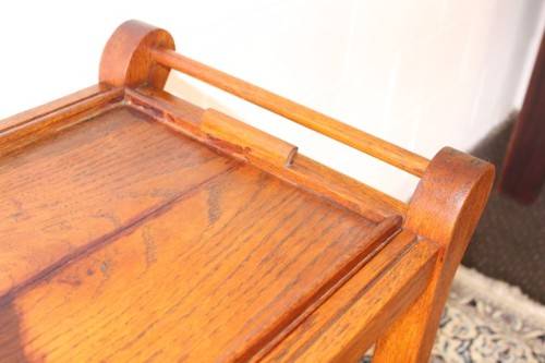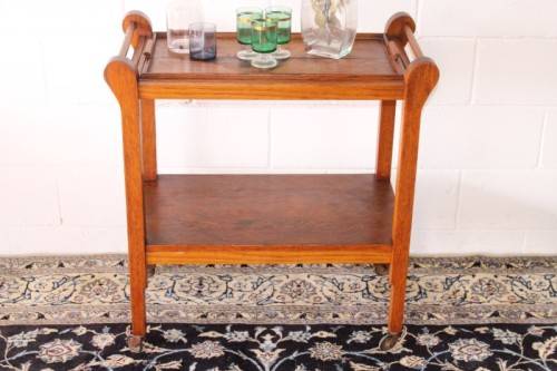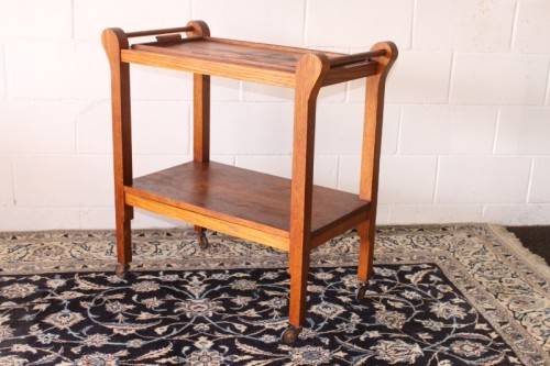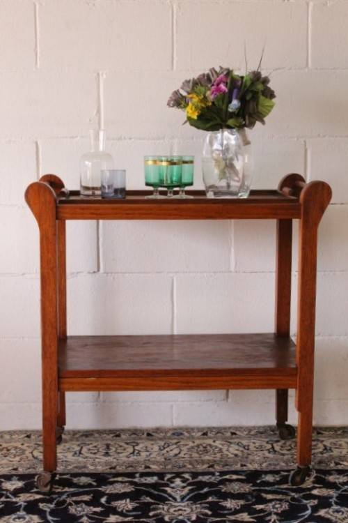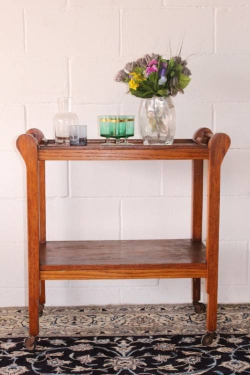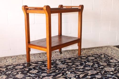 This wonderful vintage solid oak double handle 2-tier tea/ drinks trolley with removable tray on its original castors and measures 76cm long x 41cm wide x 80cm high. The top shelf of the trolley is also a serving tray and can be completely removed from the trolley to use as a serving tray. The handles on either end can also be used to hang tea-towels or dish towels. The tray is still nice and sturdy and is a well made mobile trolley. There is age and usage related wear and tear, mainly on the tray (see pics), but it is still a lovely and very practical trolley. The style of the castors leads me to believe that this is a circa 1960 to 1970's trolley. Please view the pics carefully to fully appreciate this awesome vintage oak tea/ drinks trolley and to confirm the condition.