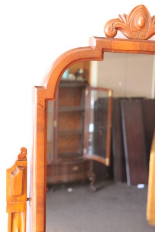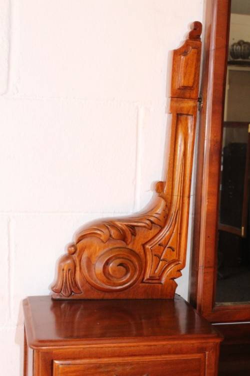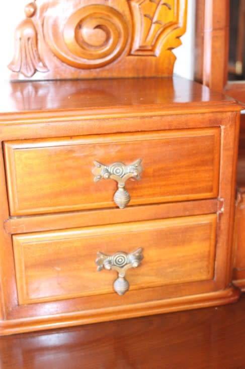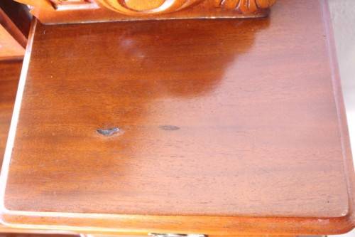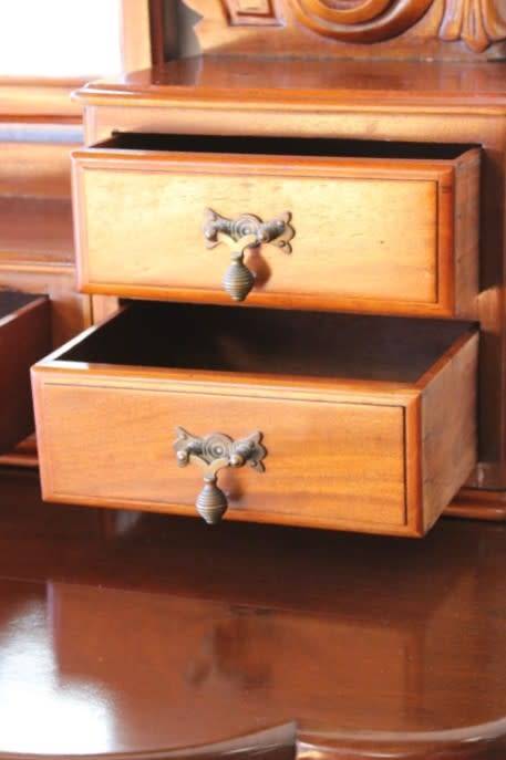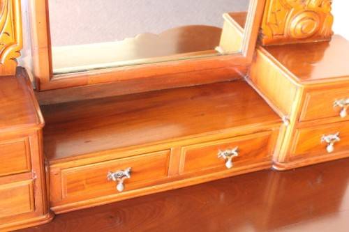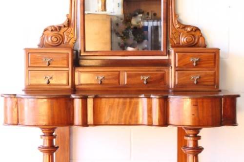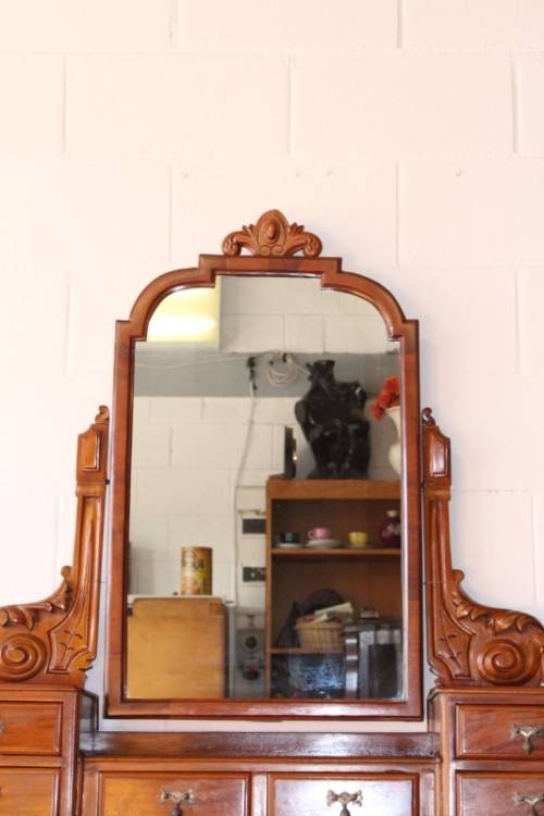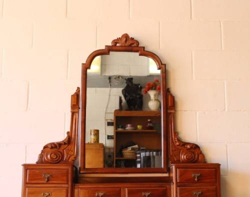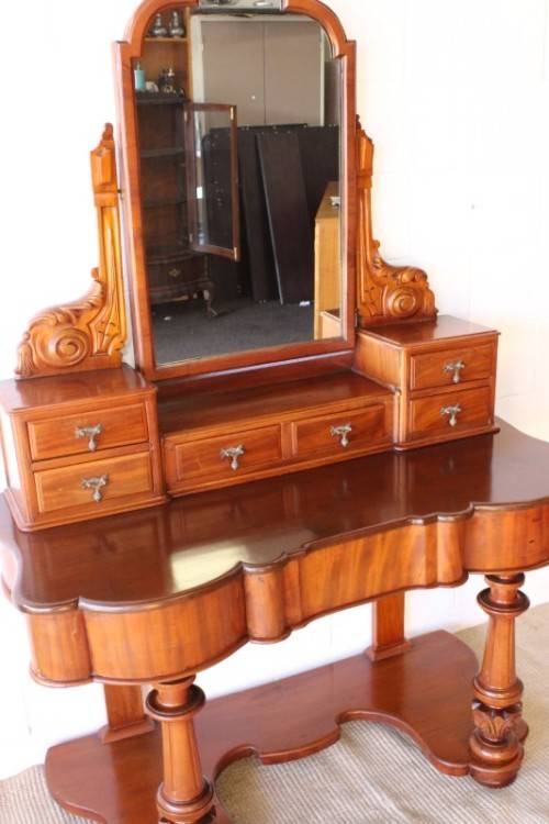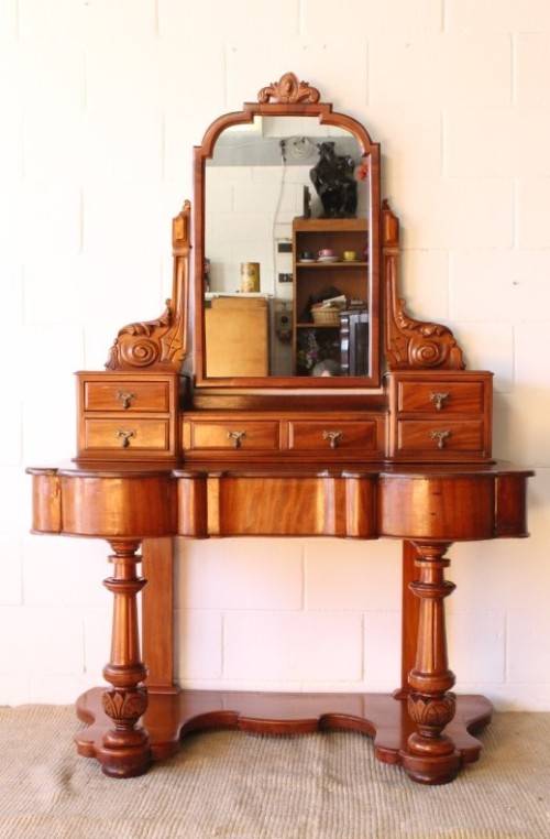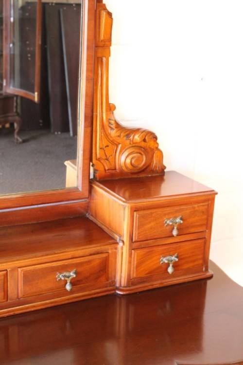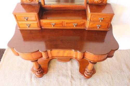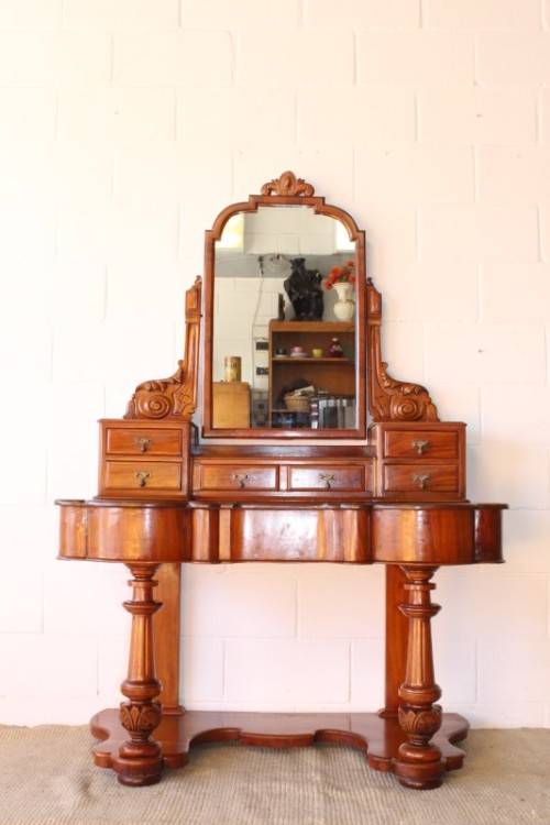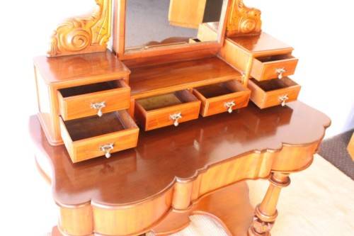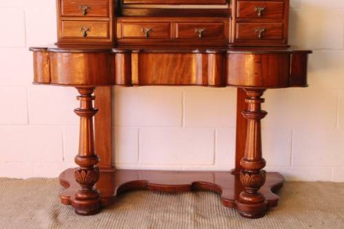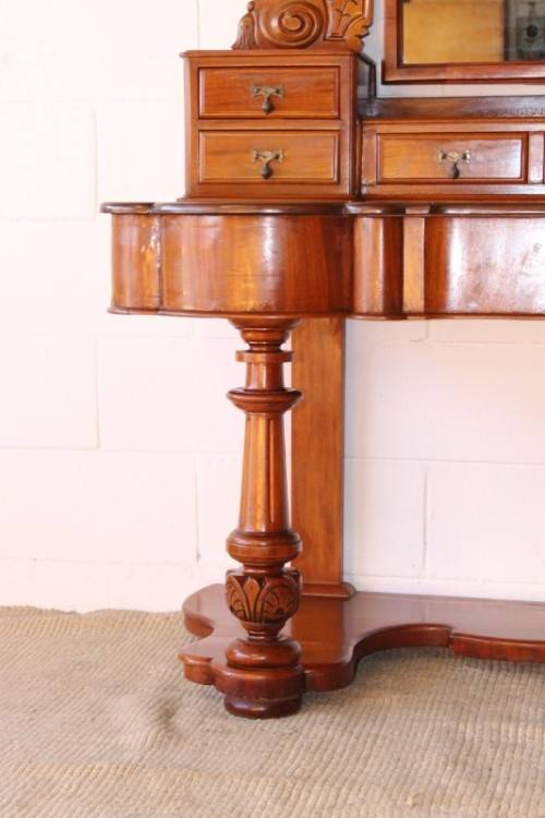 This beautiful and rare antique Victorian (circa mid 1800's) carved Duchess Rosewood and Mahogany combination dressing table has six small pigeon drawers (two on either side and two in-between) on the upper section of the dresser. The base has a single central "hidden" drawer below the dresser top and the stunningly shaped glass mirror pivots centrally on carved supports. The drawers all have the original period style metal handles, and the dresser rests on substantial turned carved legs. The dresser measures an impressive 122cm long x 60m wide x 177.5cm high. The dresser is in lovely antique condition and has all the charm and imperfections of a roughly 168-year-old dresser. Please view the pictures carefully to fully appreciate this magnificent antique Victorian dressing table and to confirm the condition.