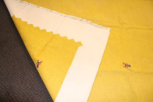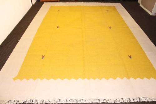 This incredible large yellow and beige/ cream colour Indian Dhurrie carpet is in beautiful condition and has minimal age and usage related wear and tear. The carpet measures a very decent 392cm long x 287cm wide. Dhurrie, sometimes spelled "dari," "durrie" or "durry," is a type of rug native to India and its surrounding regions, Burma, Pakistan and Afghanistan. These loom-woven rugs are made using techniques employed for centuries. The flat-weave design used to create Dhurrie rugs makes them both durable and decorative. The concept of Dhurrie is a little bit different from a rug or carpet, because they were used for bedding or packaging, and not only as a floor covering, but since the Dhurrie's serve the same purpose as a carpet or rugs they can be described as one. This large carpet would be perfect in a larger living room, play room, bedroom etc.