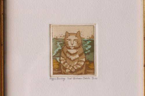 This incredible signed and numbered Maggie Burley framed hand-coloured limited edition etching is part of her exquisite contemporary collection and is titled "That Certain Smile", The etching is number 9 of only 100 ever made. The hand-coloured etching has been framed behind glass in a beautiful narrow antique gold styled frame. The framed etching measures 17cm wide x 22cm high. There is very little available on the internet about Maggie Burley other that her etchings date to the 1970's. This gorgeous etching would make a wonderful gift for a cat lover. Please view the pics carefully to fully appreciate this stunning signed limited edition etching and to confirm the condition.