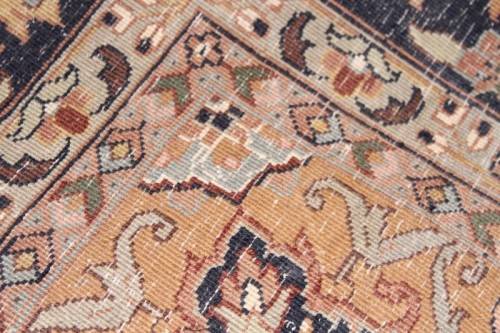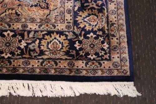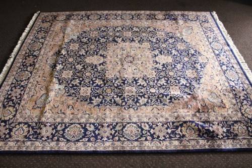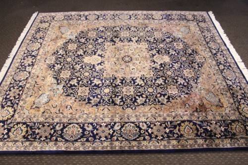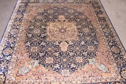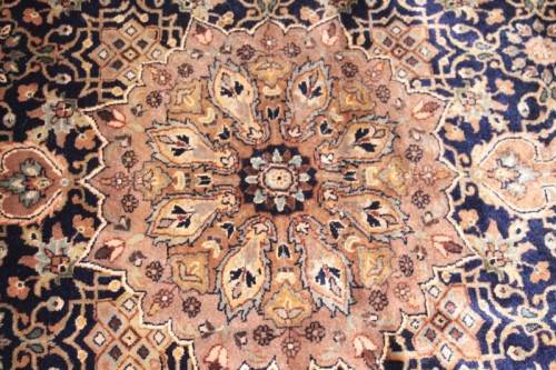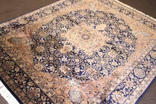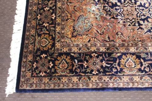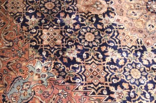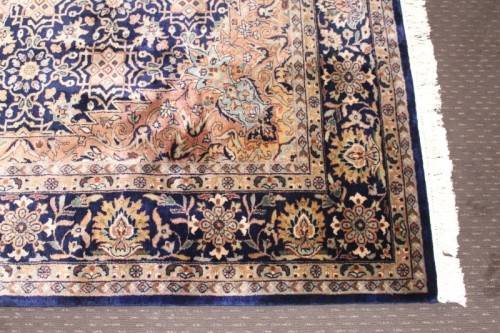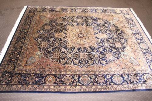 This superb and intricately detailed original Iranian Kashan Persian carpet has a longer pile and is a heavy high-quality Persian carpet. The carpet is in beautiful vintage condition with minimal wear and tear and some sun-bleaching. The Kashan carpet measures 250cm long x 202cm wide. The carpet has an array of beautiful colours that include electric blues and browns, dove grey, olive green and earth tones with white flakes. In the carpet world, Kashan is used to describe a hand knotted rug that usually contains a diamond-shaped medallion on a Shah Abbas field. Shah Abbas fields take their name from a Mogul ruler who significantly contributed to the rise of Persian textile art in the 16th and 17th centuries. Shah Abbas fields, which are used in a variety of Persian designs, contain a series of curvilinear floral forms, creating a garden-like background. They are found either in an all-over format or with a central medallion. Like many other Persian designs, the Kashan rug design takes its name from the city of its origin (found in modern-day Iran). Hailing from one of Iran’s oldest cities, Kashan, these Persian masterpieces first adorned homes and palaces as early as the 16th century. Undeniably referenced as the most glorious and beautiful of all Persian rugs, the Kashan range encapsulates much history.