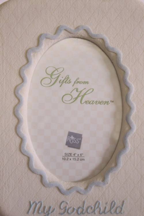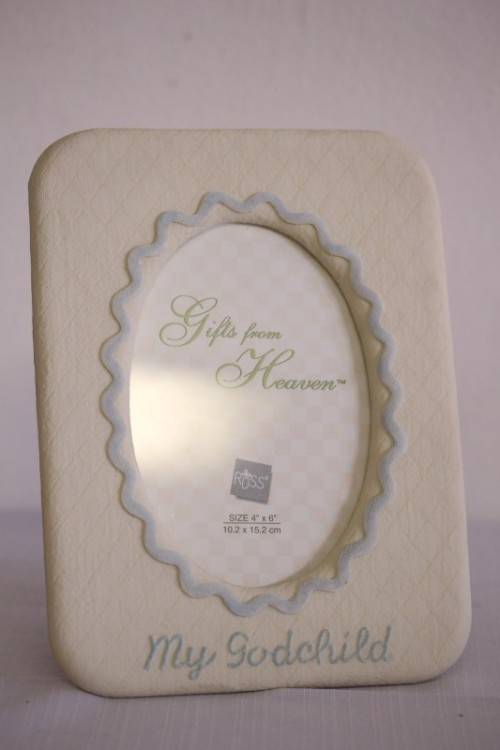 This incredible original "Russ" Berrie & Co. hand painted "My Godchild" yellow and blue photo frame is in amazing condition and has never been used. The freestanding photo frame is still in its original box and is part of the Russ Berrie & Co. "Gifts from Heaven" collection. The frame measures 16.8cm across x 22.4cm high and can hold a photo 10.2cm x 15.2cm. This frame has been discontinued, so is a scarce frame. There are absolutely no chips or cracks in the resin frame. Please view the pics carefully to fully appreciate this stunning boxed Russ photo frame and to confirm the condition. PLEASE NOTE THAT WE ONLY HAVE TWO AVAILABLE.