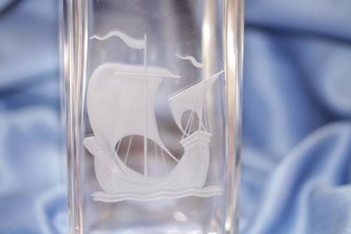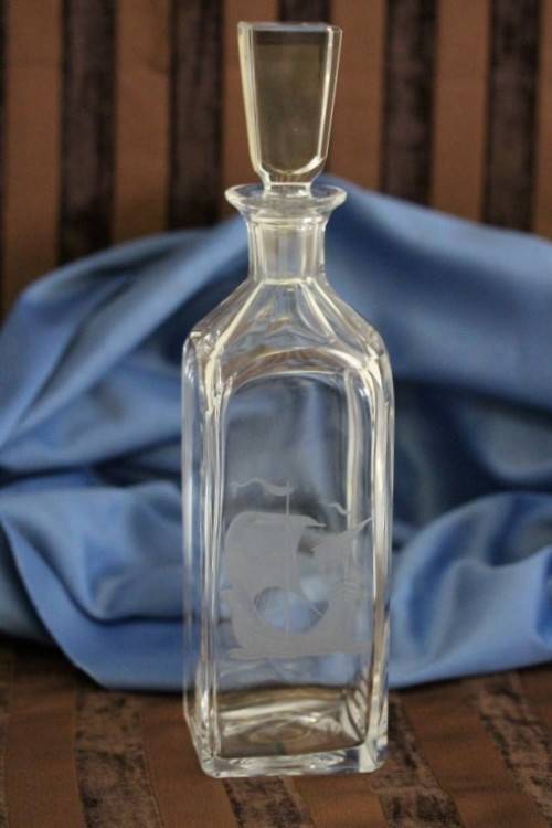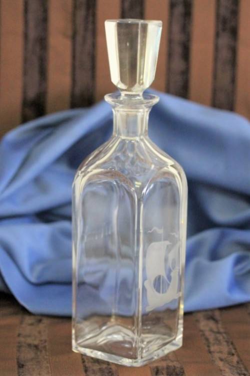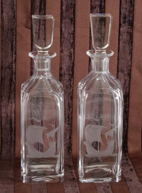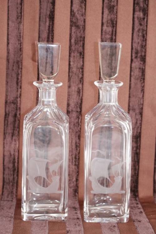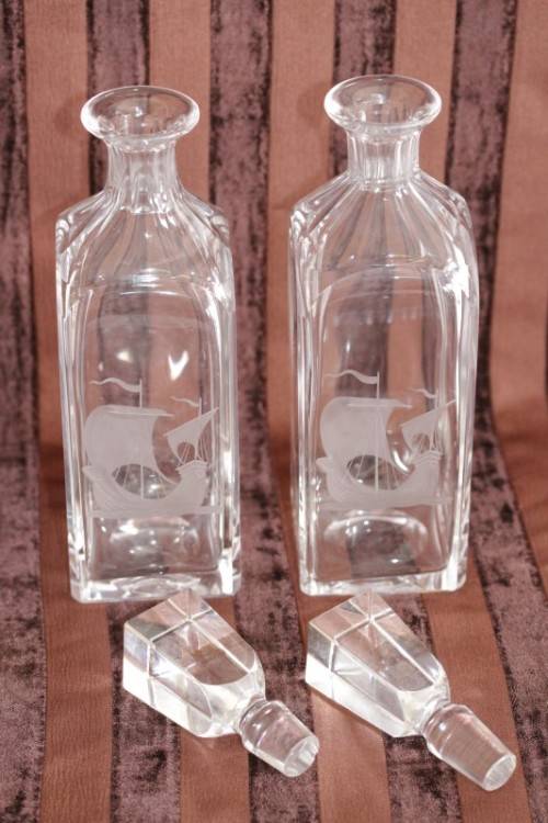 This superb original vintage Swedish "Kosta" crystal decanter with engraved sailing ships is in stunning condition and has no chips or cracks in the decanter or in the crystal stopper. The decanter is 27.5cm high x 7cm wide and is a 500ml decanter. The base of the decanter is engraved "Kosta". Kosta or Kosta Boda has been making glass since 1742 and is highly regarded as one of the leading glass manufacturers and is the oldest, still operational glassworks in Sweden. The decanter would make a stunning addition to any liquor cabinet or liqueur tray. We have two identical decanters on offer. The one decanter stopper is slightly shorter than the other and there is a small bubble mark on the edge of one stopper = not chipped. These decanters are extremely rare and in fabulous condition. Please view the pics carefully to fully appreciate this superb Swedish crystal decanter and to confirm the condition.