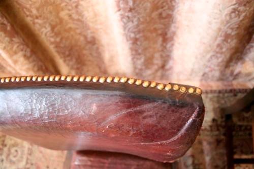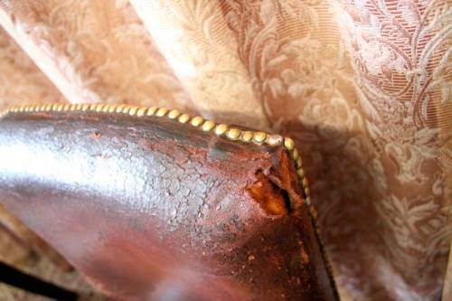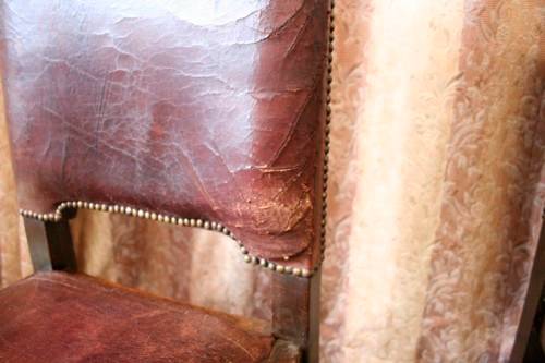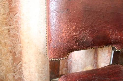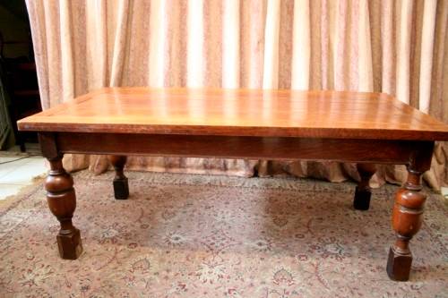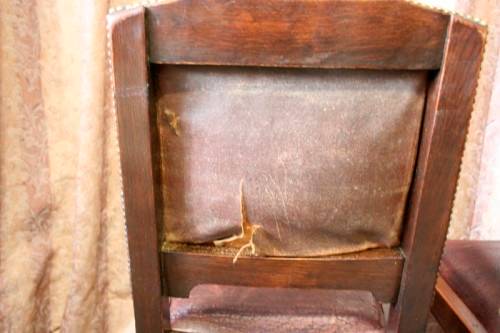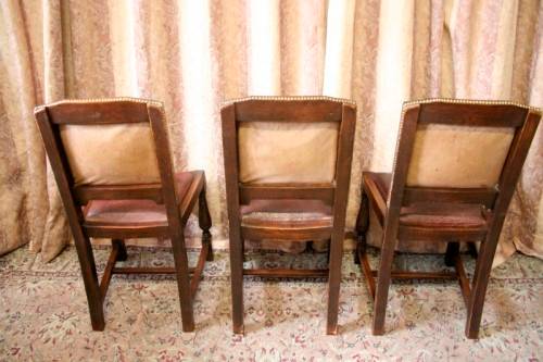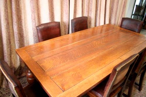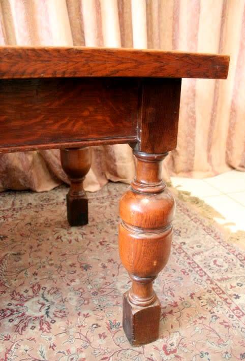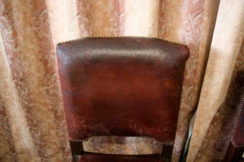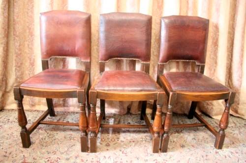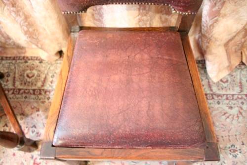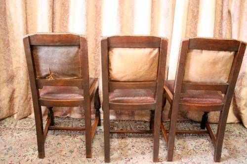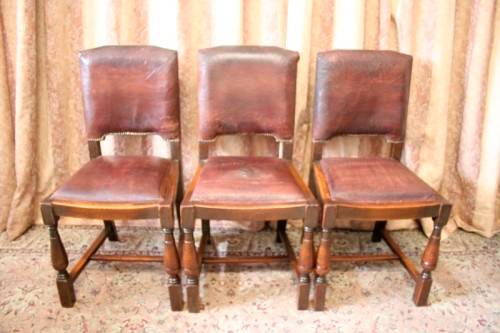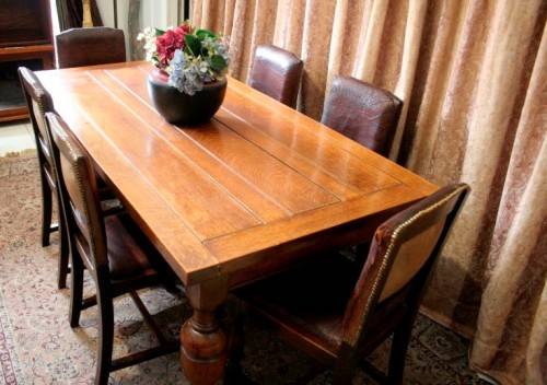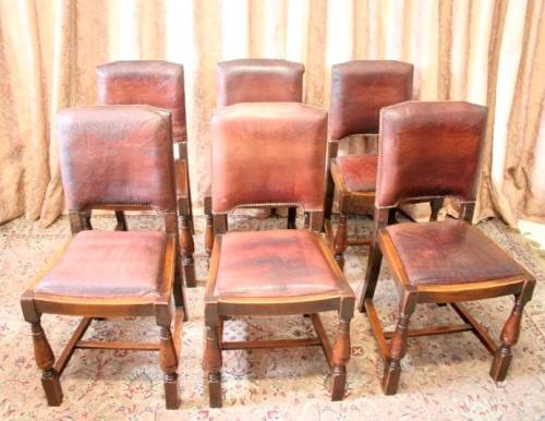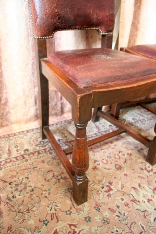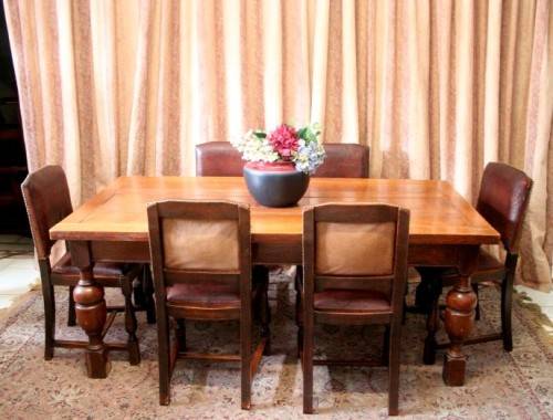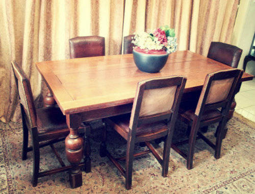 This fabulous vintage solid Oak 6-seater dining room table has 6 leather chairs with it. The dining room table measures 92cm across x 182cm long x 75m high and has an ultra-imposing solid legs. The chairs measure 43cm x 45cm x 91cm high.The table is in great condition. The leather on the six chairs is very old and has age related wear and tear as seen in the pics. The studs on the surround of the chairs are all usable should you wish to re upholster the chairs. Please view the pictures carefully to fully appreciate this fantastic dining room suite and to confirm the condition. Please view the shipping options or request courier costs prior to purchasing any of our products.