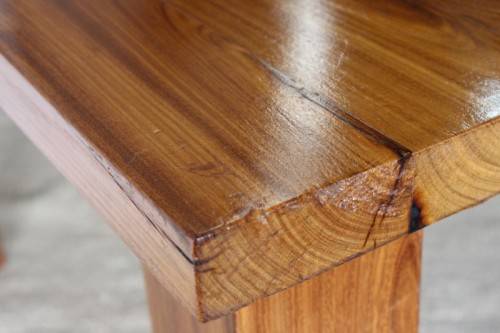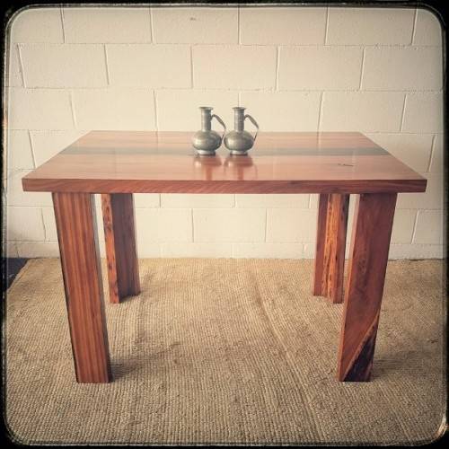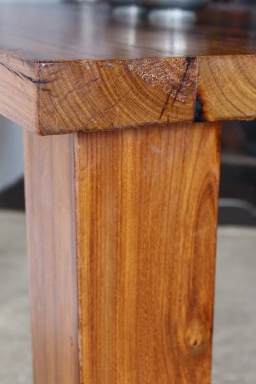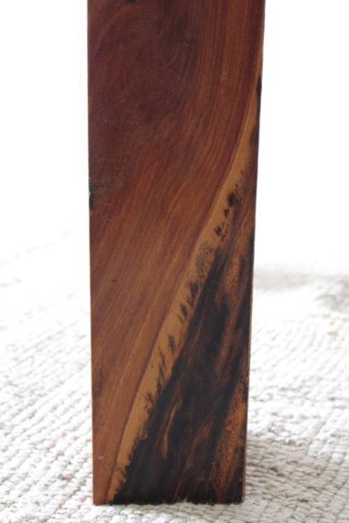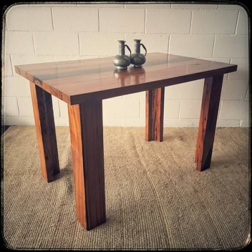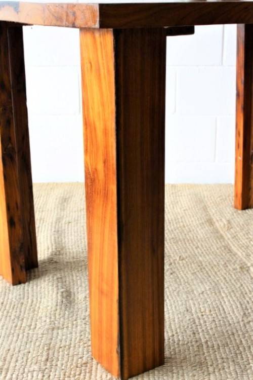 This beautiful and well made polished solid sleeper wood (Rhodesian Teak) four-seater dining table is a stunning heavy table and has clean uncomplicated lines. The table measures 118cm long x 76cm wide x 77cm high. The table would be amazing in a smaller dining room, or on a patio or even as a reception table in a living room etc. The table is in good condition with normal age and usage related wear and tear and scuffs etc. The one leg has been re-enforced under the table top and is not visible. The table has all the amazing colours and textures of sleeper wood with a polished finish. Please view the pics carefully to fully appreciate this solidly made table and to confirm the condition.