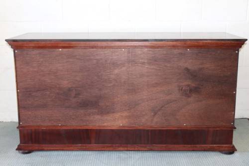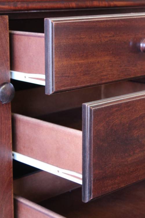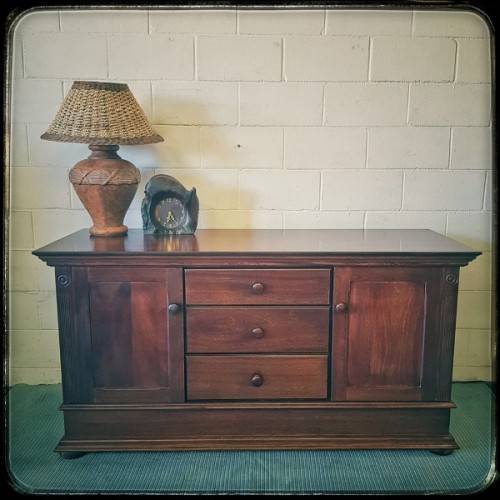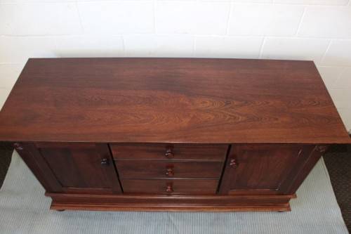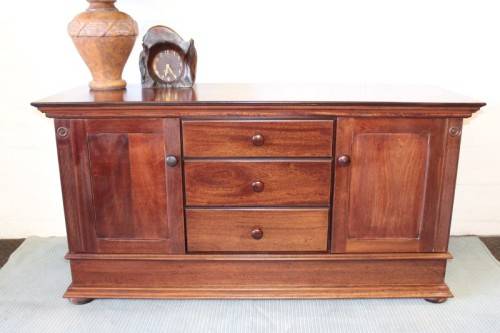 This awesome and modern styled top-quality double door, three drawer buffet side server has ample space for all your cutlery and crockery. The side server measures a decent 162cm long x 58cm wide x 83cm high and is in great condition. The server rests on round feet and has pillar style detailing on either end of the cupboard doors. The three drawers are on runners and are smooth sliding and the shelves in the cupboards have three height setting or could be removed to store candelabra's etc. The server has light scuffs on the top (see pics), but is still a stunning and quality piece that would look fantastic in just about any dining room. Please view the pics carefully to fully appreciate this well made buffet side server and to confirm the condition.
