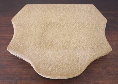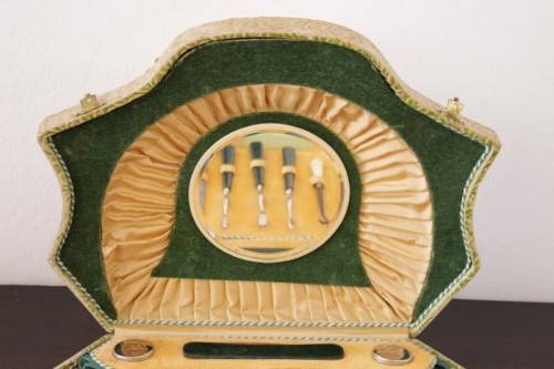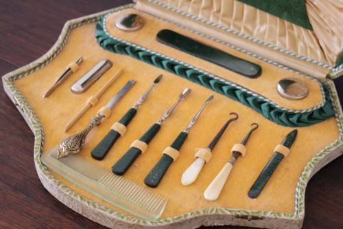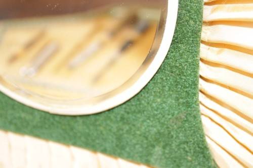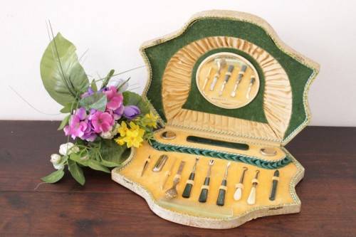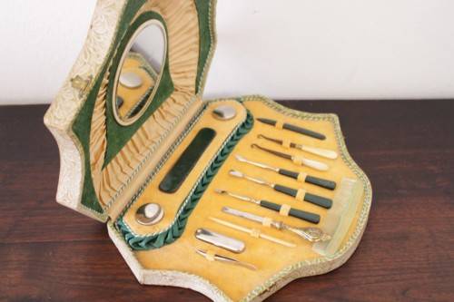 This incredible antique boxed vanity and manicure set includes two shoe lace pullers (one with a mother of pearl handle & one with an ivory?/ bone handle), a metal needle & thread holder, a green celluloid and leather nail buffer, an array of green celluloid manicure tools, two metal button/ stud holders, a comb (not antique) and a pair of tweezers (not antique). The set is in a beautiful period style Art Deco display box which is lined in a combination of gold satin and green and yellow velvet and the box has a round bevelled glass mirror on the lid. The pieces are in gorgeous antique condition and has been very well looked after. The box has a little age related wear and tear, but both clasps are still intact and the hinges are firm. There are no tears in the fabrics and all the holder cuffs are intact too. This is a beautiful and well presented antique set that would look amazing on any ladies dressing table. The box is roughly 33cm long x 26cm wide x 4.5cm high. Please view the pics carefully to fully appreciate this awesome antique boxed vanity and manicure set and to confirm the condition.