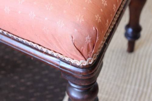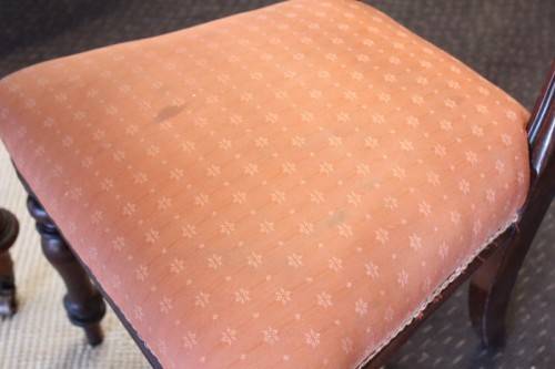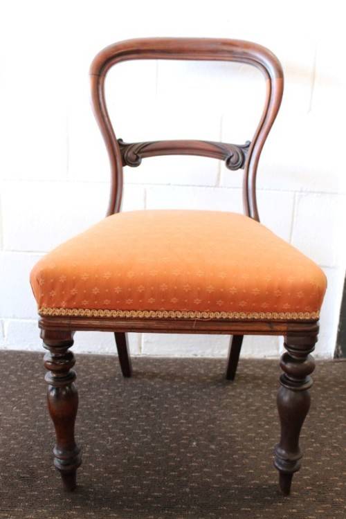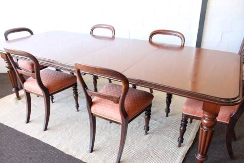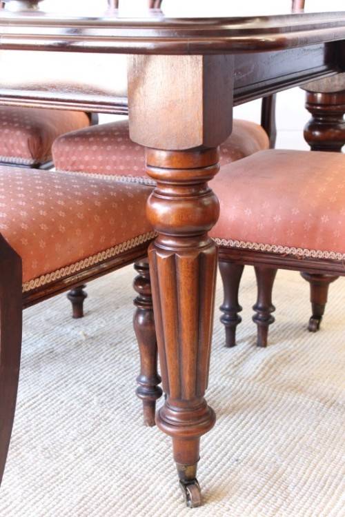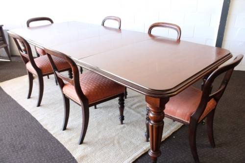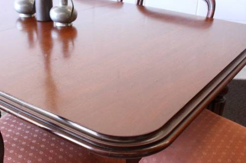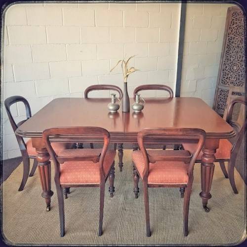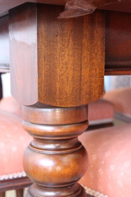 This superb mahogany six to eight-seater dining room suite with a large extendable table and six exquisite balloon-back upholstered dining chairs is in great condition and is a high-end dining room suite. The table is large enough to accommodate up to 10 dining chairs with a squeeze, but comfortably eight with the two extension panels inserted (use the six existing chairs and get two stylish carver chairs). The incredible stylish table legs on the original brass castors makes it a particularly beautiful table that would look amazing along side a buffet server etc. The table measures a very decent 162cm long (and extends to 261cm) x 111cm wide x 77cm high and the chairs each measure 54cm long x 48cm wide x 87cm high. The upholstery is still in good condition (normal usage related wear and tear and marks) and the chairs can be re-upholstered to suite your decor or colour scheme. The chairs sit firmly on the ground and are comfortable quality chairs. This dining suite is a very attractive suite and the quality is very evident in just handling the furniture. Please view the pics carefully to fully appreciate this stunning large family size/ entertainers size dining suite and to confirm the condition.