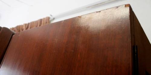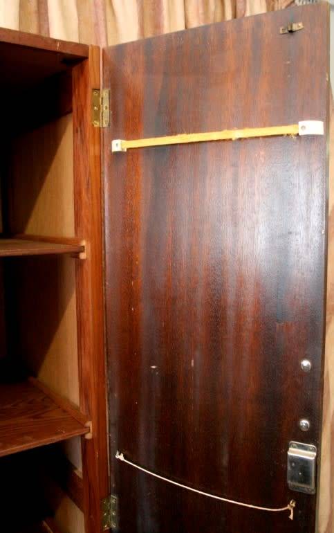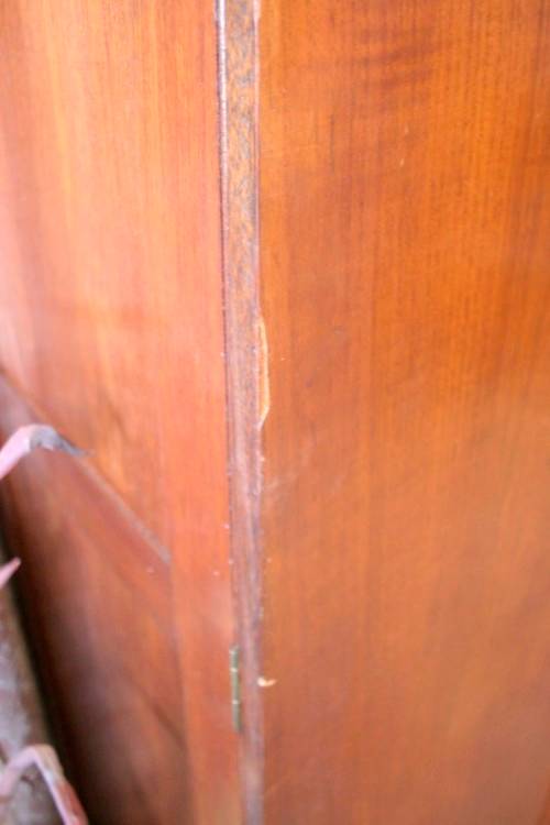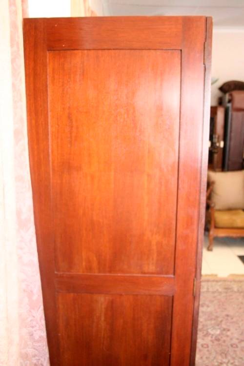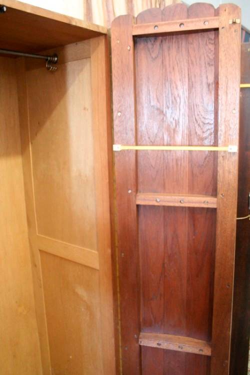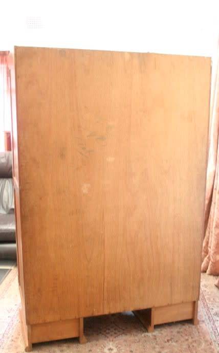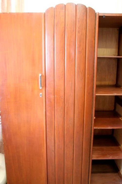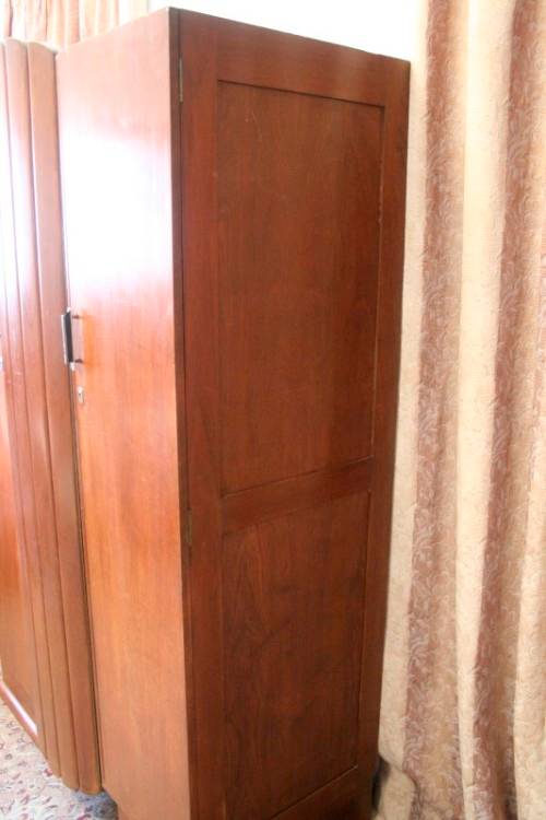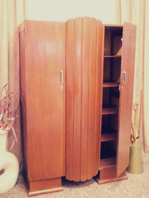 This stunning vintage Art Deco styled three door Imbuia wardrobe measures 123cm long x 56cm wide x 192cm high and has four large shelves and ample hanging space. The wardrobe is in great condition with normal age and usage related wear and tear. The wardrobe is very well made and sits well on the ground. This is a very beautiful and superbly crafted wardrobe that was made to last. It would also make an amazing drinks cabinet or linen cupboard with additional shelves in the hanging section. Please view the pics carefully to fully appreciate this truly awesome wardrobe and to confirm the condition.
