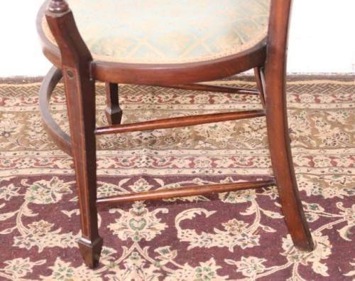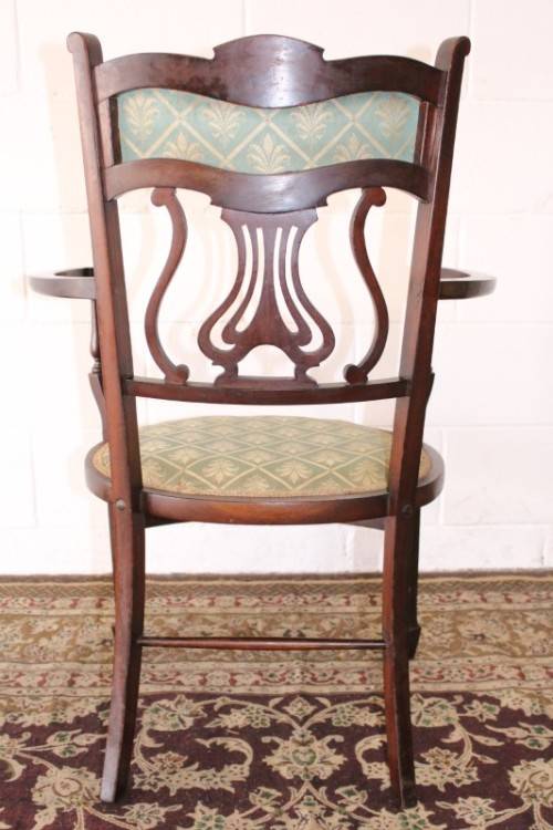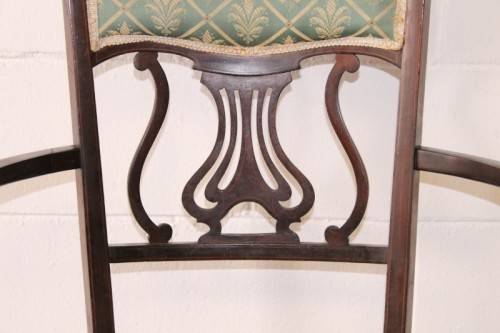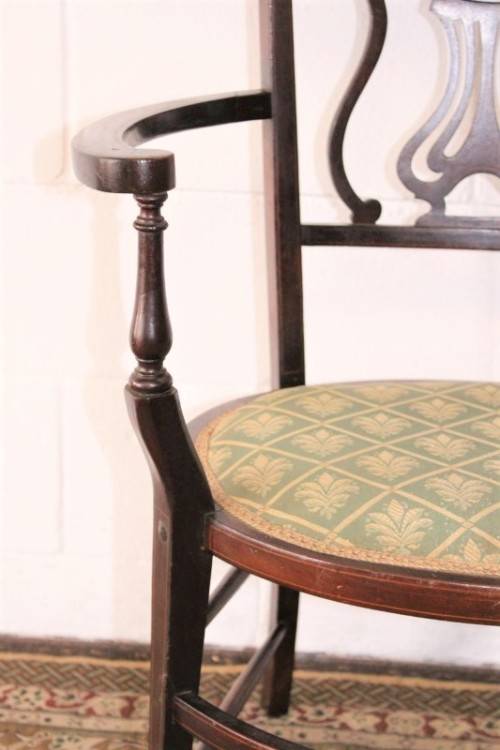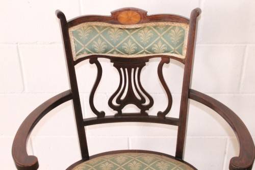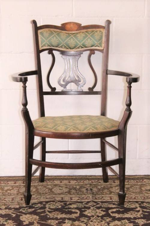 This exceptionally rare antique Lyre-back Hepplewhite elbow-chair with marquetry inlay detailing is an incredible find and one of only a handful of these beautiful horse-shoe style elbow chairs that I have come across. The beautifully upholstered chair measures 62cm long x 50cm wide x 88cm high. The wonderful inlay detailing is carried through from the marquetry rosette in the backrest to the stunning tapered spade-foot legs. The carved lyre or harp-back completes this beautifully appointed chair. The elbow chair was greatly used as a desk chair at a writing bureau or ladies writing desk from the mid 1700's to the mid 1900's. This chair most likely dates to the later part of the 1800's to the very early 1900's. The chair is in wonderful condition for its age and has been well cared for. The upholstery is newer and suits the chair to a "T". There is minimal age and usage related wear and tear and scuffs etc. Please view the pics carefully to fully appreciate this stylish Victorian Elbow chair with marquetry inlay detailing and to confirm the condition. Please view the shipping options or request courier costs prior to purchasing any of our products.